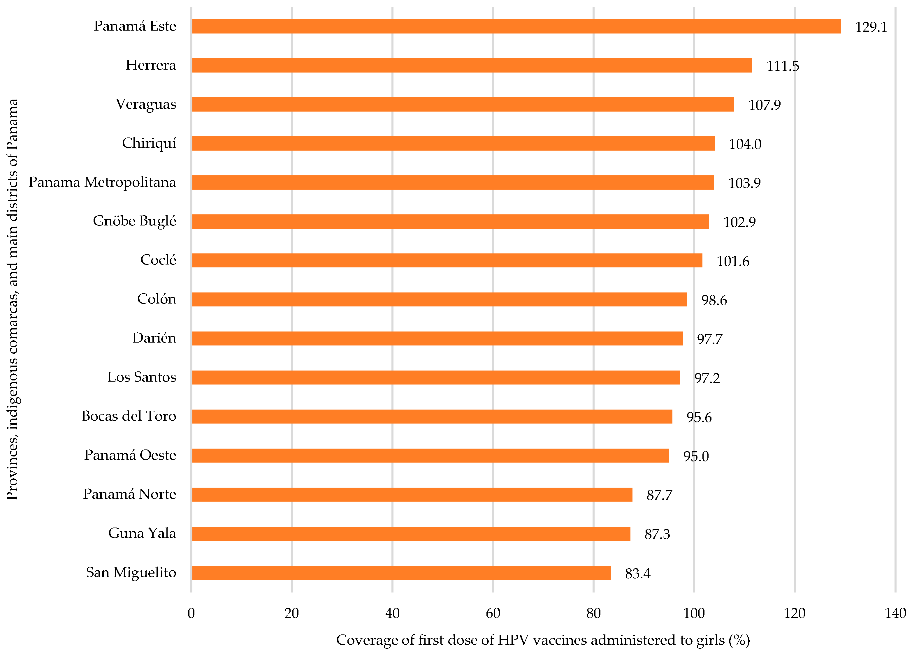 Figure 2 depicts the HPV vaccine coverage for Dose 1 among girls by geographic region since the start of the vaccination efforts in 2008. The residential peri-urban region of Panamá Este has the highest coverage rate (129.1%), while peri-urban Panamá Norte (87.6%), the indigenous Comarca of Guna Yala (87.3%), and the densely populated inner-city district of San Miguelito (83.4%) present the lowest coverage rates, below the expected 90%. The rest of the provinces, urban or rural, are closer to 100% coverage, with seven provinces reporting coverage above 100%.
