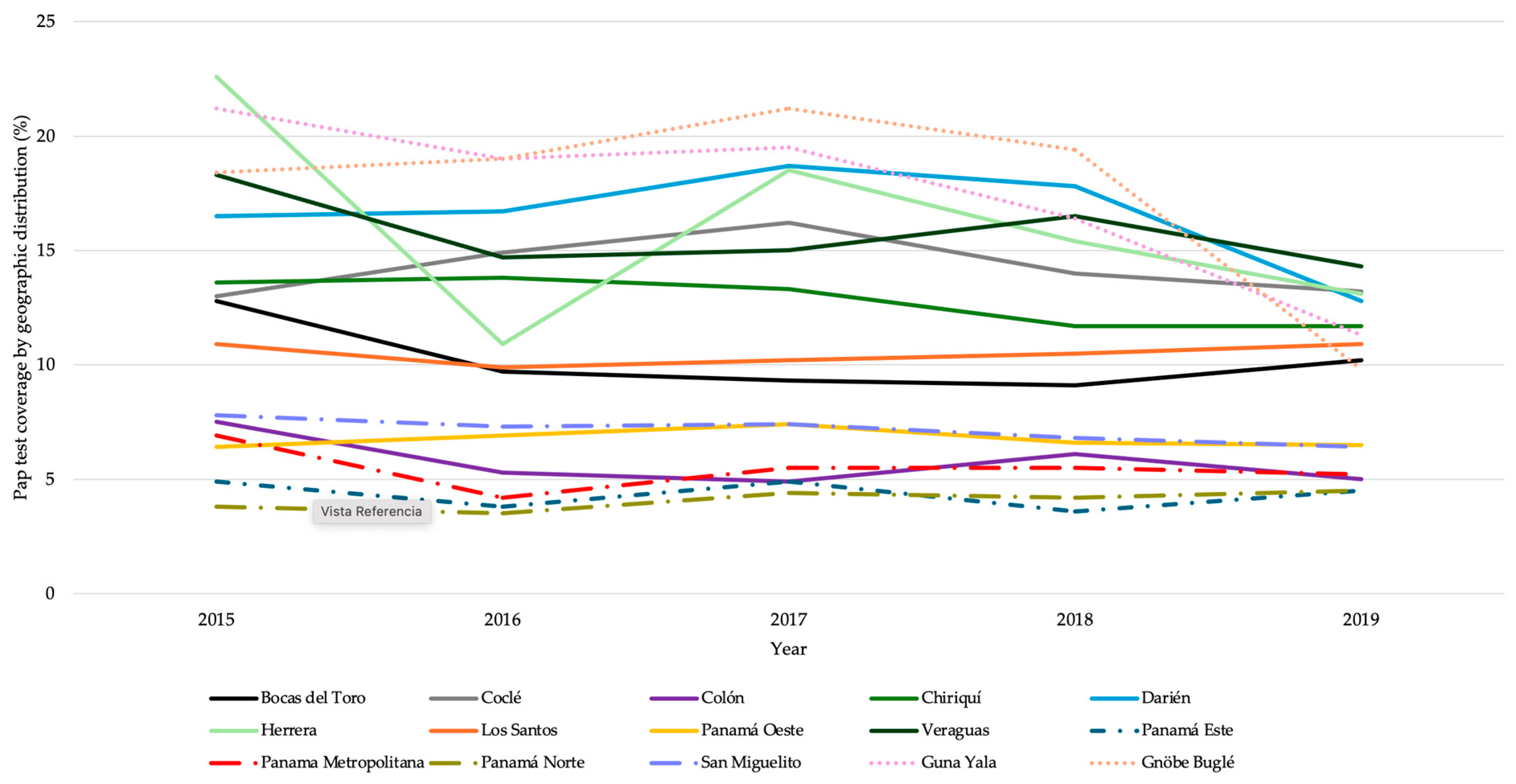 Pap tests conducted between 2015 and 2019 indicate low performance of screening procedures (Figure 3), with stark differences observed among regions. In any given year, on average, among all regions and at a national level, Pap tests are performed in 8–10% of the eligible population. A trend regional analysis, through a Chi-square test of independence, indicates steady progression with a significant decrease in rural Herrera in 2016 and the indigenous Ngäbe-Buglé comarca in 2019 (p < 0.0001).
