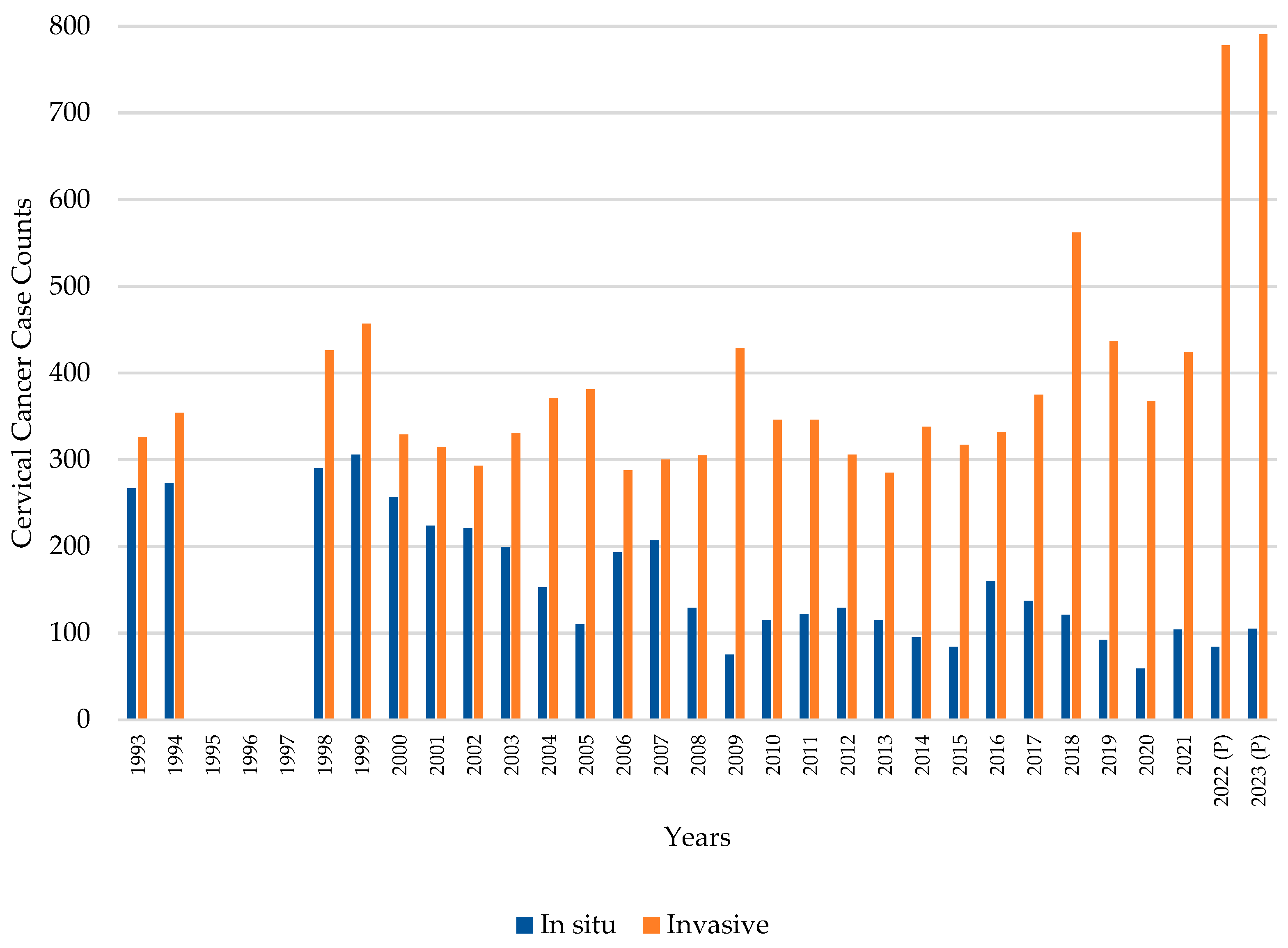 A downward trend in CC cumulative incidence rate has been observed in Panama since 1990 (Figure 4), in contrast to the increasing trend of invasive CC over time compared to in situ diagnoses presented in Figure 5. This observation has remained steady since 1993, even with a gap in data between 1995 and 1997. Of the total 15,336 reported CC cases between 1993 and 2023, 4426 (28.9%) were classified as in situ, while 10,910 (71.1%) were classified as invasive.