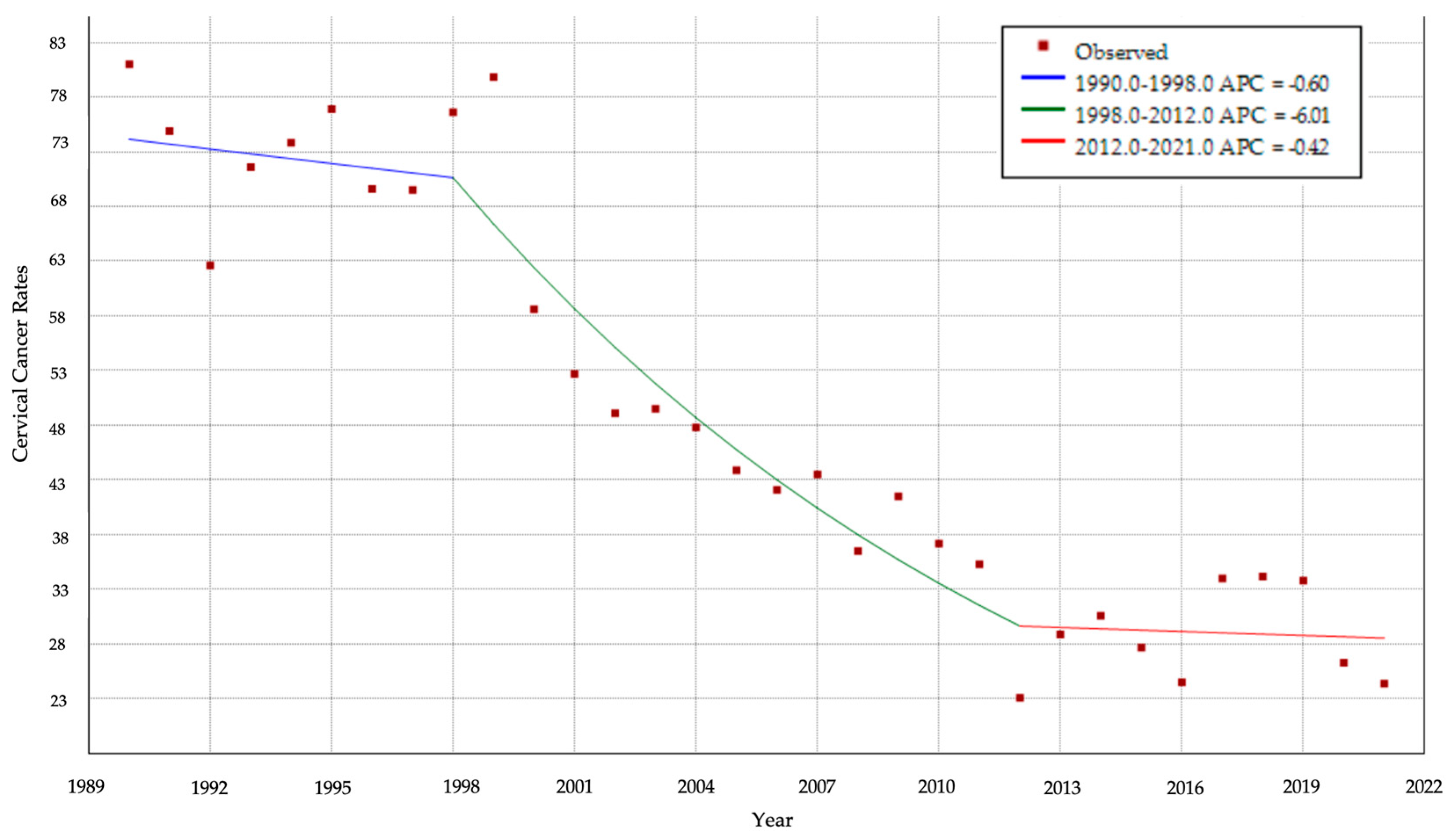 A Joinpoint analysis was conducted for CC cumulative incidence rates in Panama over 32 years (Figure 6). Two change points were identified: in 1998 and 2012. From 1990 to 1998, rates declined slightly (APC = −0.60%/year; blue segment). Between 1998 and 2012, the decline accelerated markedly (APC = −6.01/year; green segment), with cumulative incidence rates falling drastically. This observed decline between 1998 and 2012, is significant. From 2012 to 2021, the trend flattened with a minimal additional decrease (APC = −0.20%/year; red segment).