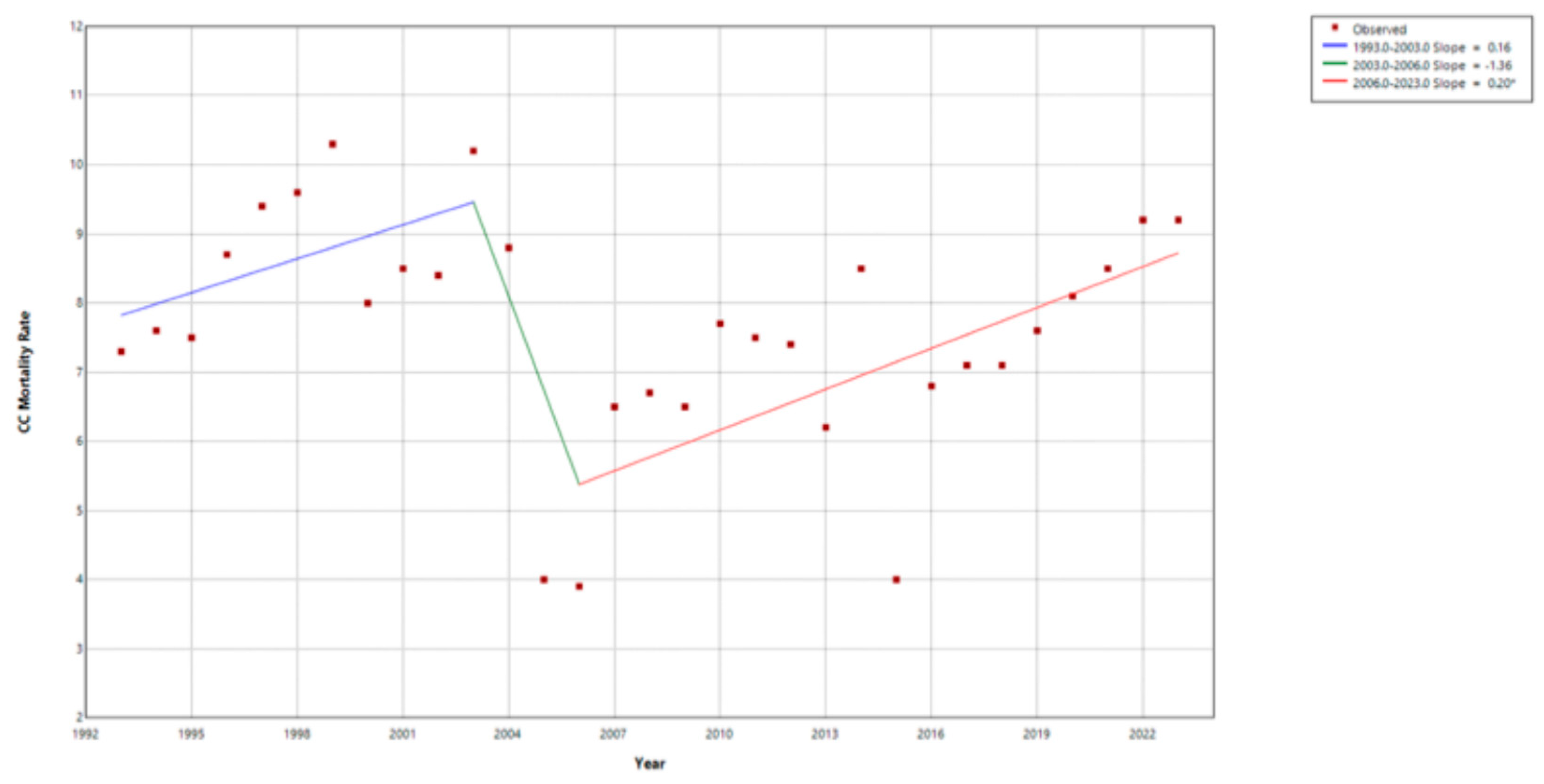 Figure 8. Trend analysis of cervical cancer mortality rates using Joinpoint in Panama, 1993–2023.