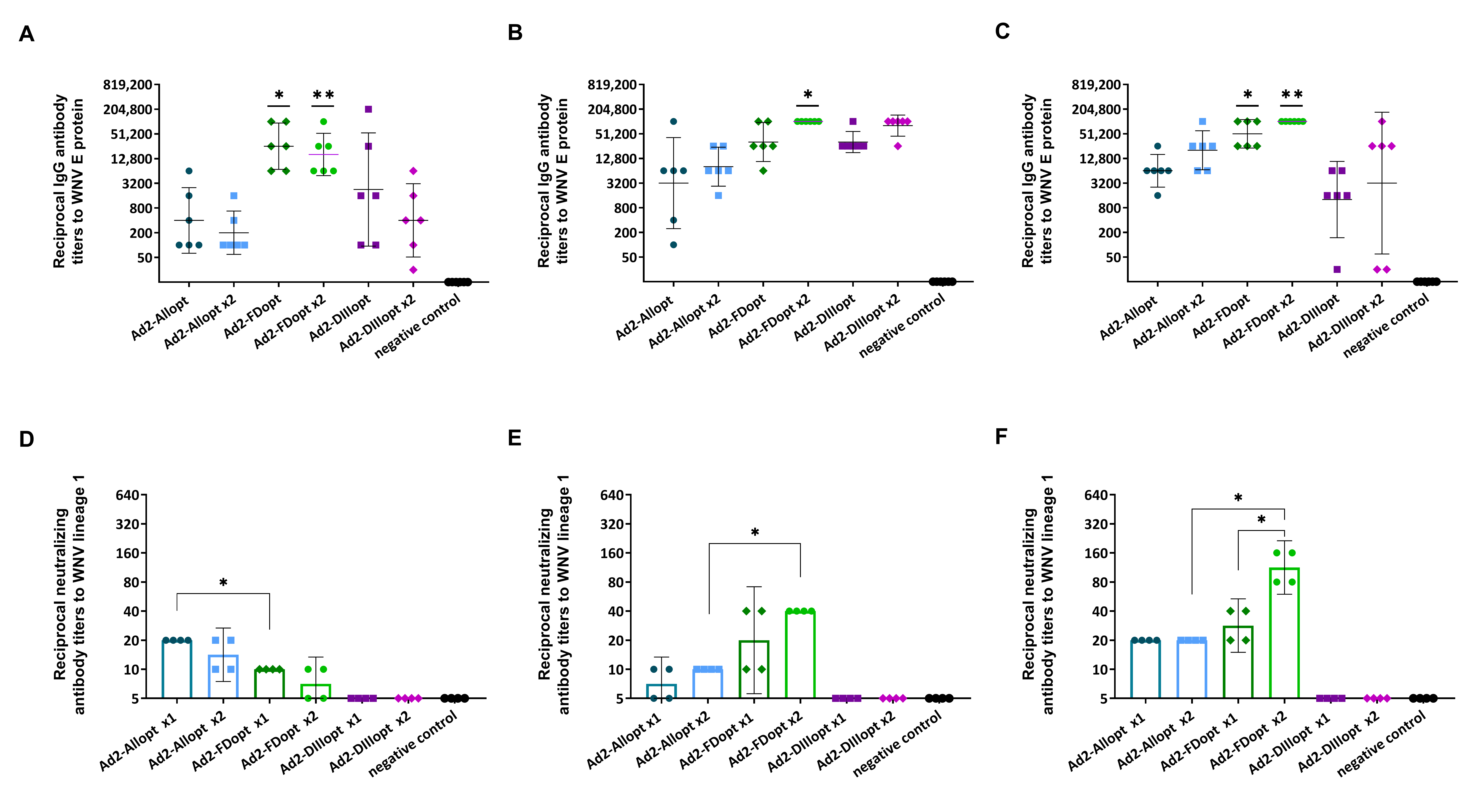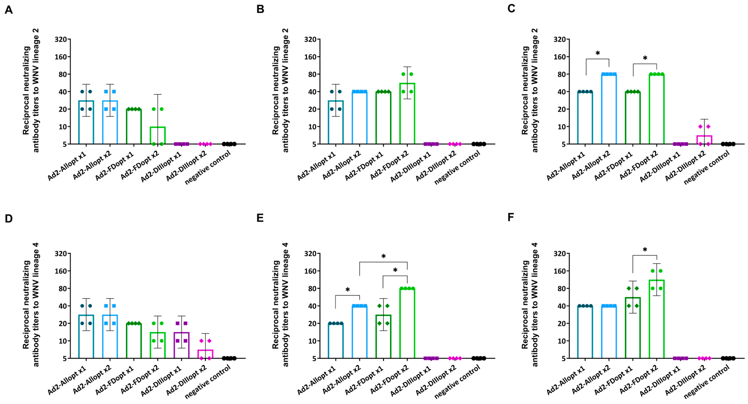 3.3. A Double Immunization with rAd2 Expressing the Optimized WNV preM/E Gene Carrying a Fusion Loop Mutation in the E Protein Protects Against Lethal WNV Infection