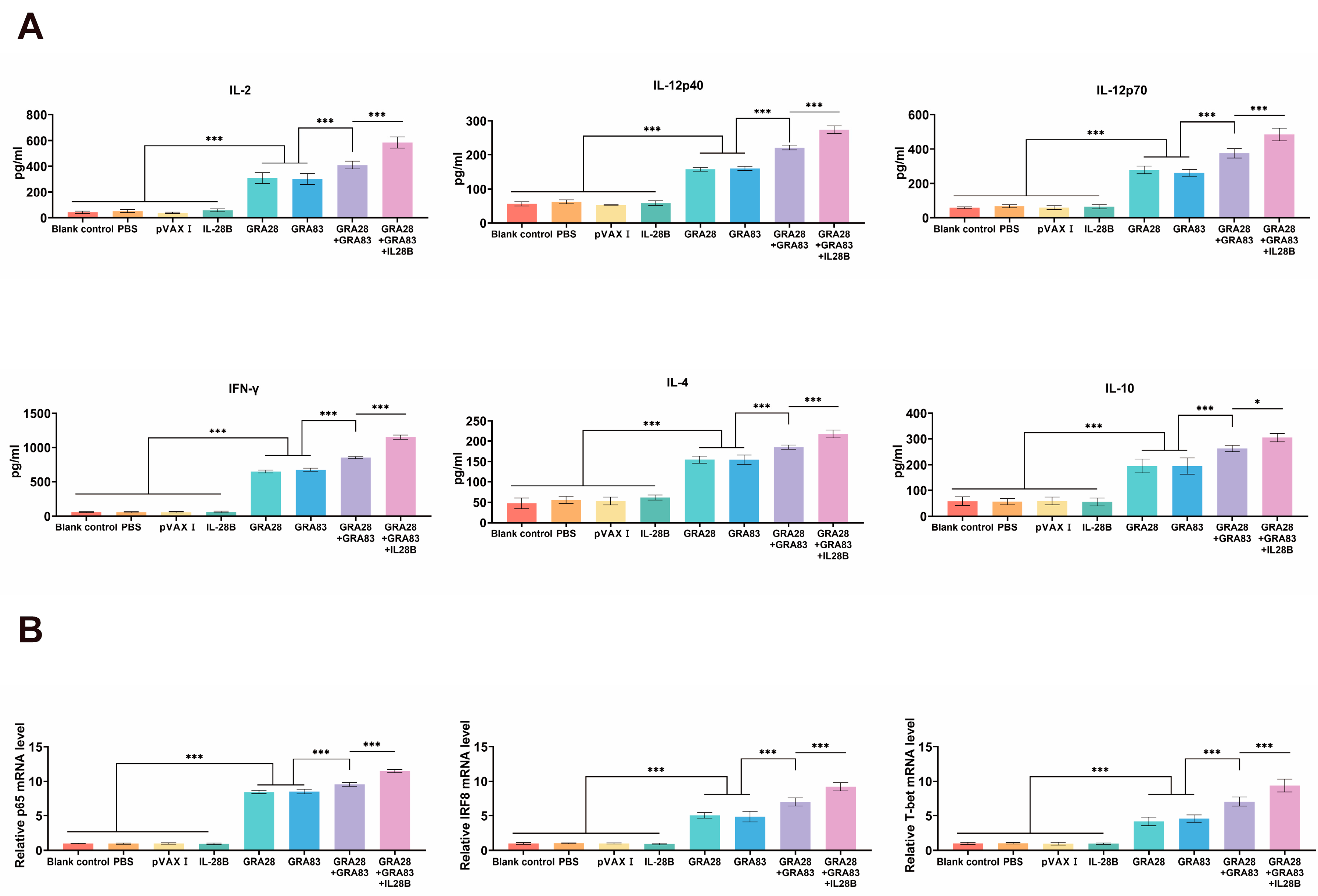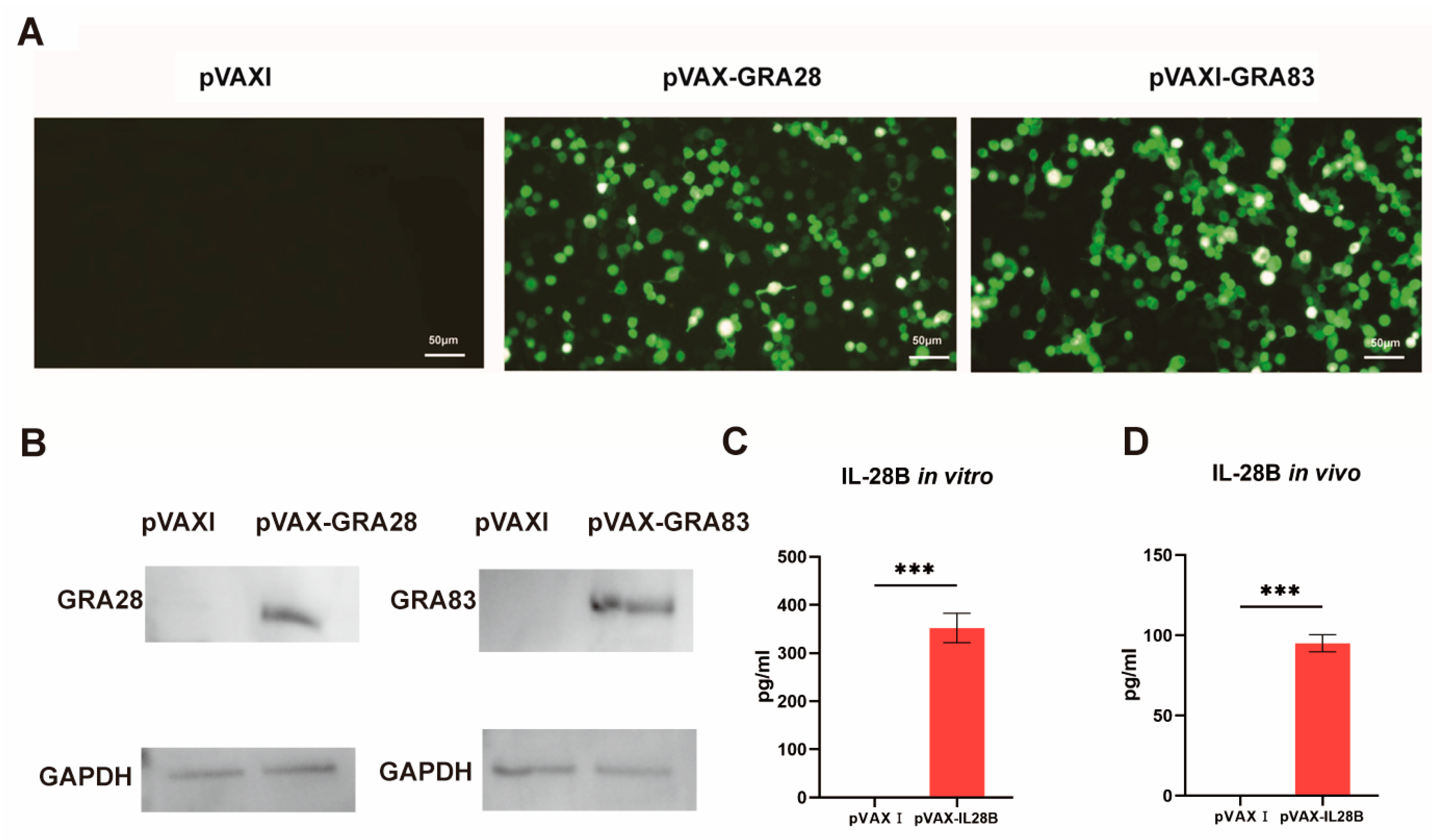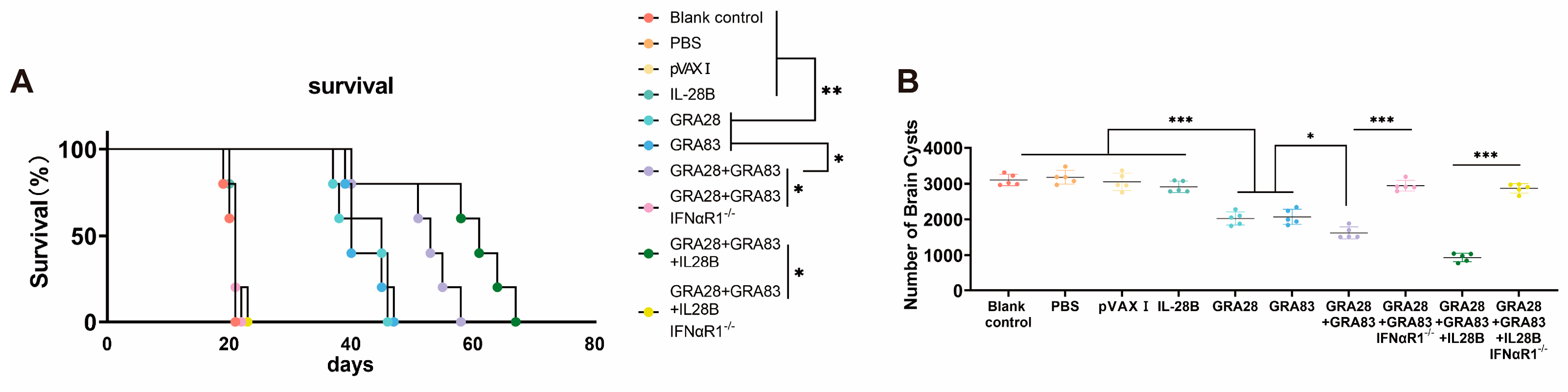 Chicago/Turabian StyleFang, Jun, Jingqi Mu, Rui Li, and Jia Chen. 2025. "Protective Efficacy of Two Novel DNA Vaccine Candidates Encoding TgGRA28 and TgGRA83 with an IL-28B Molecular Adjuvant Against Acute and Chronic Toxoplasmosis in Mice" Vaccines 13, no. 12: 1180. https://doi.org/10.3390/vaccines13121180