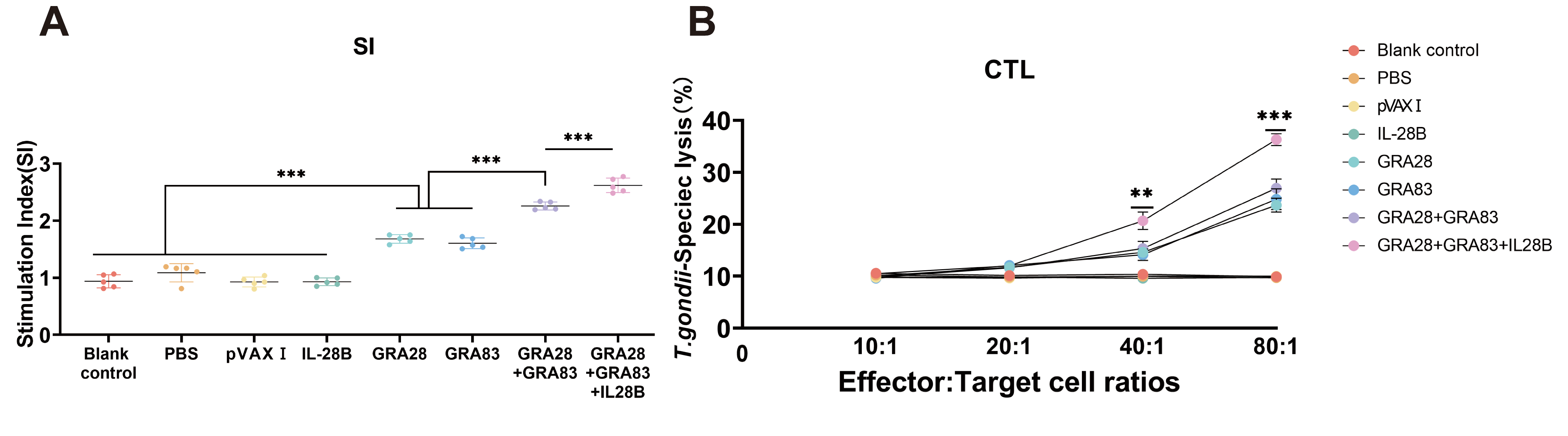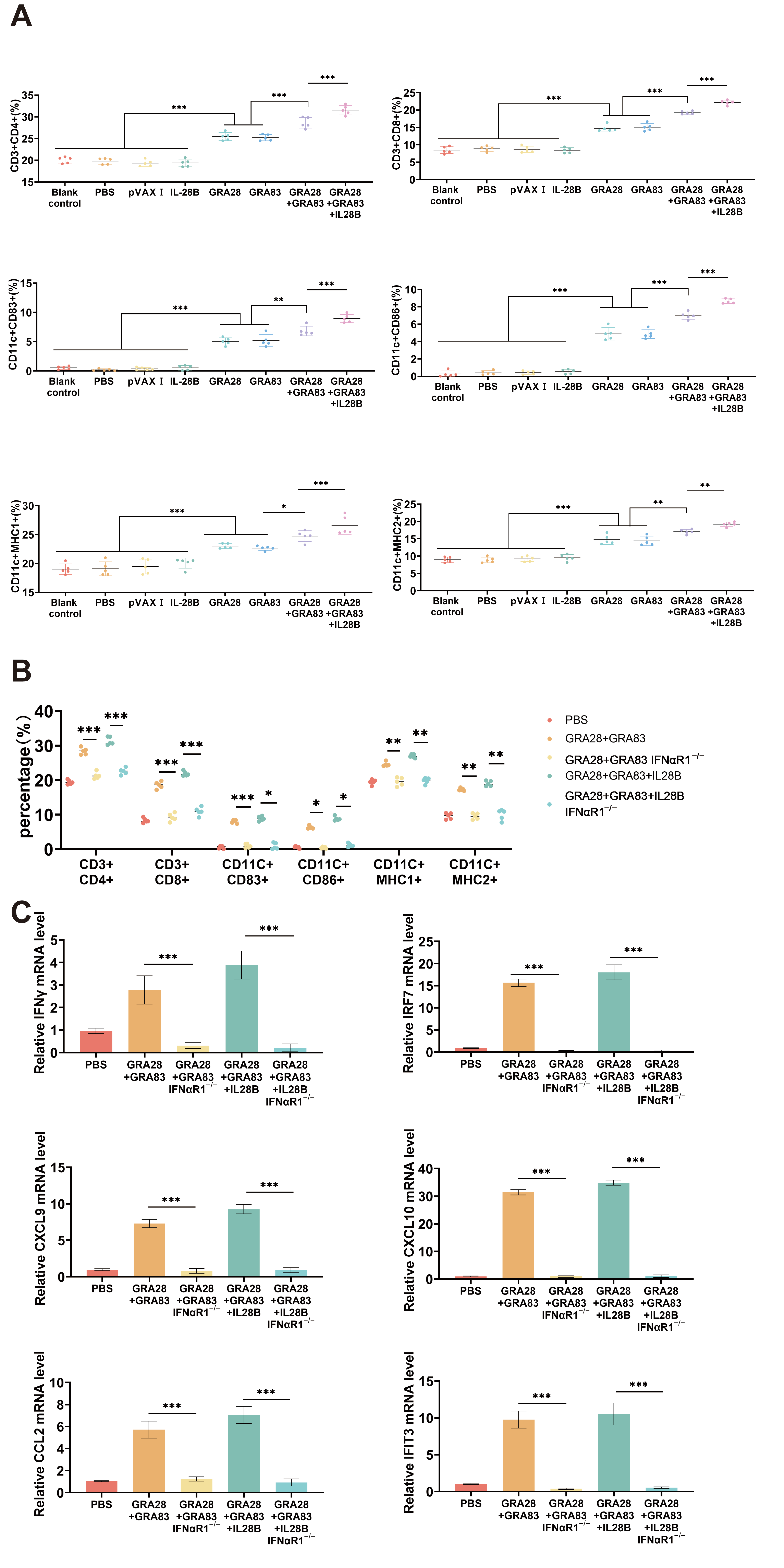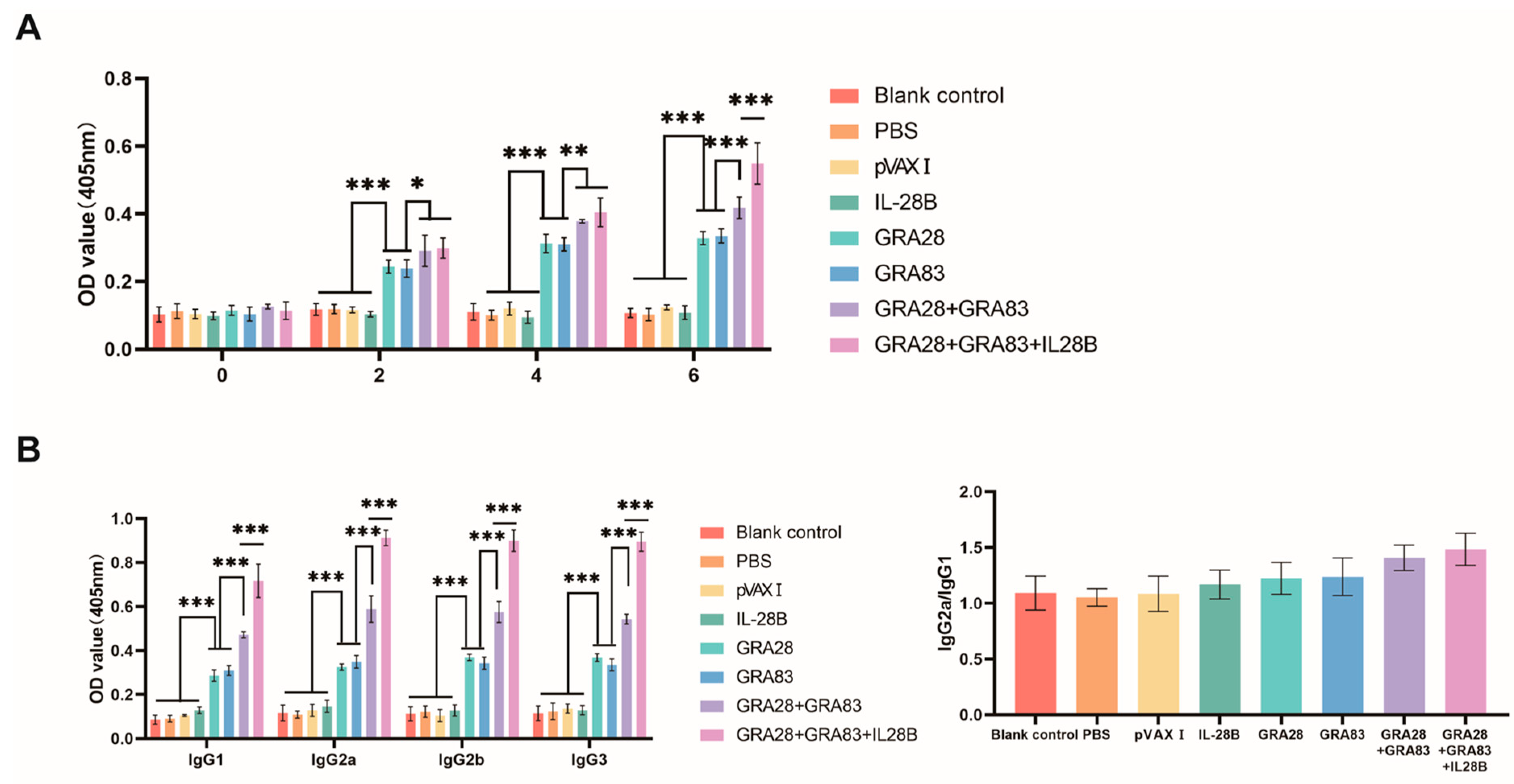 Chicago/Turabian StyleFang, Jun, Jingqi Mu, Rui Li, and Jia Chen. 2025. "Protective Efficacy of Two Novel DNA Vaccine Candidates Encoding TgGRA28 and TgGRA83 with an IL-28B Molecular Adjuvant Against Acute and Chronic Toxoplasmosis in Mice" Vaccines 13, no. 12: 1180. https://doi.org/10.3390/vaccines13121180