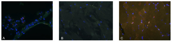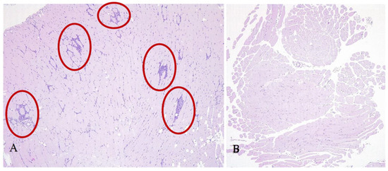 In the early phase of the study (week 4), several animals exhibited multiple foci of endomysial inflammation. These lesions were characterized by clusters of histiocytes and lymphocytes surrounding viable muscle fibers with internalized nuclei—typical features of early post-injury inflammatory response (Figure 9A). Affected muscles also displayed a pronounced regenerative pattern, including a high proportion of myofibers with centrally located nuclei (up to 70–90%), rounded fiber morphology, and signs of endomysial lipomatosis, reflecting tissue remodeling after transient damage.