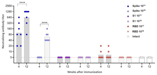 Neutralizing antibodies to the Beta variant of the SARS-CoV-2 in the sera of immunized mice. The dots represent individual values for each animal; the columns represent the geometric mean titers (GMT) by groups. **** p < 0.0001, statistically significant difference in titers between 4 and 12 weeks (ANOVA with Tukey’s post hoc; Kruskal–Wallis test with Dunn’s multiple comparisons).