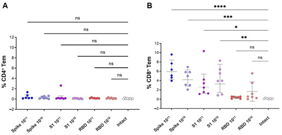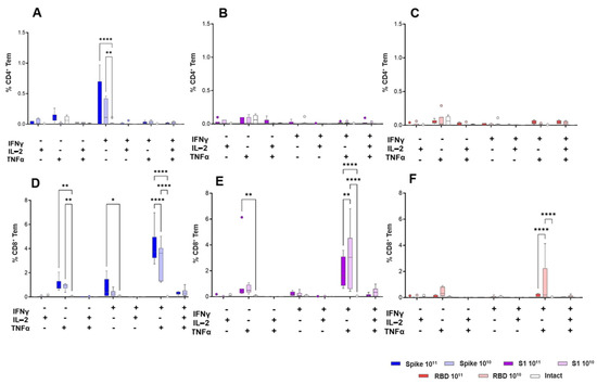 Analysis of the total cytokine production (IFNγ/IL-2/TNFα) did not reveal a pronounced dose-dependent effect for all the studied constructs. Differences were noted when analyzing the proportion of IFNγ+/IL-2-/TNFα+ CD8+ Tem lymphocytes. In the groups immunized with the adeno-associated vector expressing the full-length Spike protein, a direct relationship was observed between the dose and the relative number of IFNγ+/IL-2-/TNFα+ CD8+ Tem cells, and in the groups immunized with the S1 and RBD constructs, an inverse relationship was observed. The differences observed here were statistically significant (p < 0.05, one-way ANOVA with Tukey’s test) and consistent with the overall pattern of stronger responses induced by the full-length Spike construct across humoral and cellular assays.