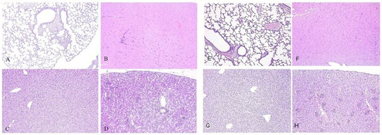 No pathological changes were observed in the lungs, heart, liver, or kidneys in any of the animal groups throughout the entire study period and in all groups (Figure 10A–H).
