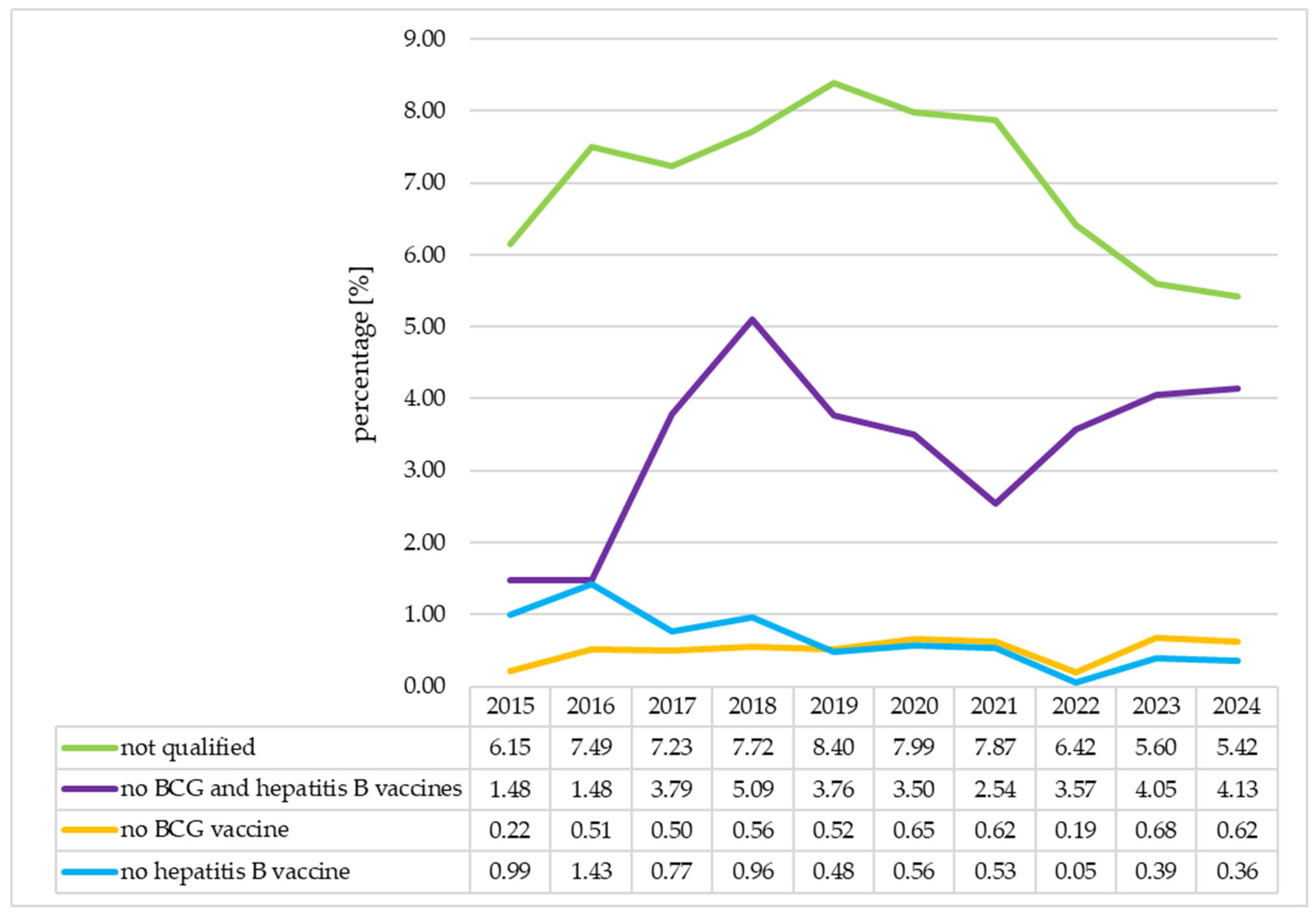 The percentages of neonates not qualified for vaccination and not vaccinated with both vaccines, the BCG vaccine and the hepatitis B vaccine were analyzed in individual years. The percentage of neonates not qualified for vaccination increased between 2015 and 2019 (6.15% vs. 5.43%, p = 0.006). Then, it decreased between 2019 and 2024 (8.40% vs. 5.43%, p = 0.000). There was a significant increase in the percentage of neonates not vaccinated with both vaccines between 2015 and 2018 (1.45% vs. 5.09%, p = 0.000). Then, between 2018 and 2021, this percentage decreased significantly (5.09% vs. 2.54%, p = 0.000) and increased again between 2021 and 2024 (2.54% vs. 4.13%, p = 0.005). The percentage of neonates who did not receive the BCG vaccine increased between 2015 and 2024 (0.22% vs. 0.62%, p = 0.036). However, in 2022, there was a significant decline in the percentage of neonates from this group (2021 vs. 2022: 0.62% vs. 0.19%, p = 0.049), which returned, in the following year, to values similar to those from before 2022 (2022 vs. 2023: 0.19% vs. 0.68%, p = 0.031). The percentage of neonates who did not receive the hepatitis B vaccine decreased between 2015 and 2024 (0.99% vs. 0.36%, p = 0.025). In this case, there was a similar significant decline in 2022 and an increase the following year (2021 vs. 2022: 0.53% vs. 0.05%, p = 0.006; 2022 vs. 2023: 0.05% vs. 0.39%, p = 0.039). Detailed data are presented in Figure 2.