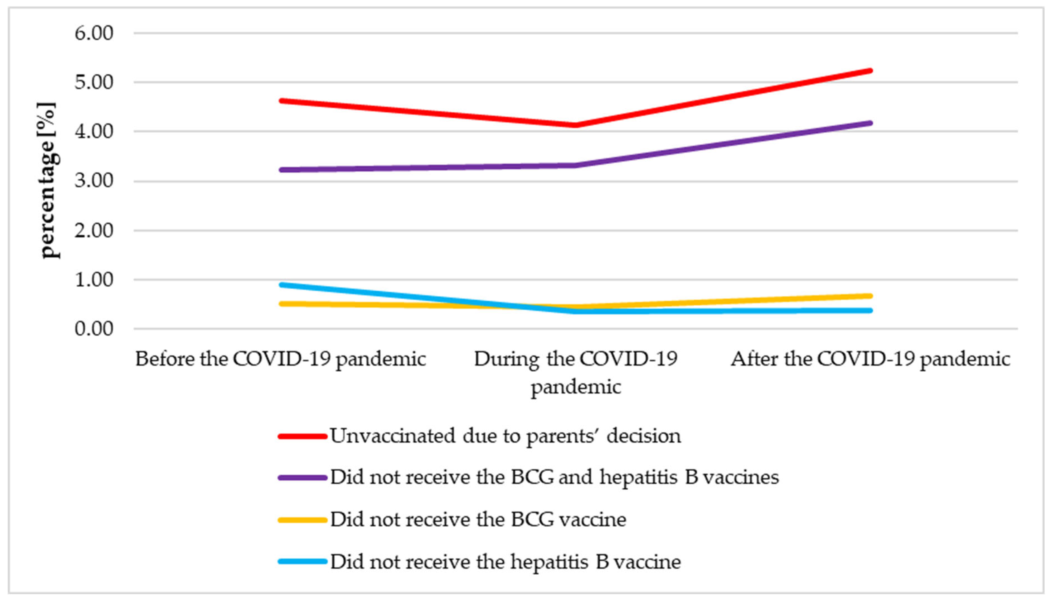 The percentage of neonates unvaccinated due to parents’ decision was significantly higher in the post-pandemic period than during the pandemic (p = 0.012). The percentage of neonates who did not receive the BCG and hepatitis B vaccines was significantly higher after the COVID-19 pandemic, when compared to the pre-pandemic period (p = 0.009). Contrary, when compared to the pre-pandemic period, the percentage of neonates who did not receive the hepatitis B vaccine was significantly lower during the pandemic and in the post-pandemic period (p = 0.000 and p = 0.003, respectively). The percentage of neonates not vaccinated with both vaccines did not change significantly in the periods studied. Detailed data are presented in Table 5. Time trends were presented graphically in Figure 5.