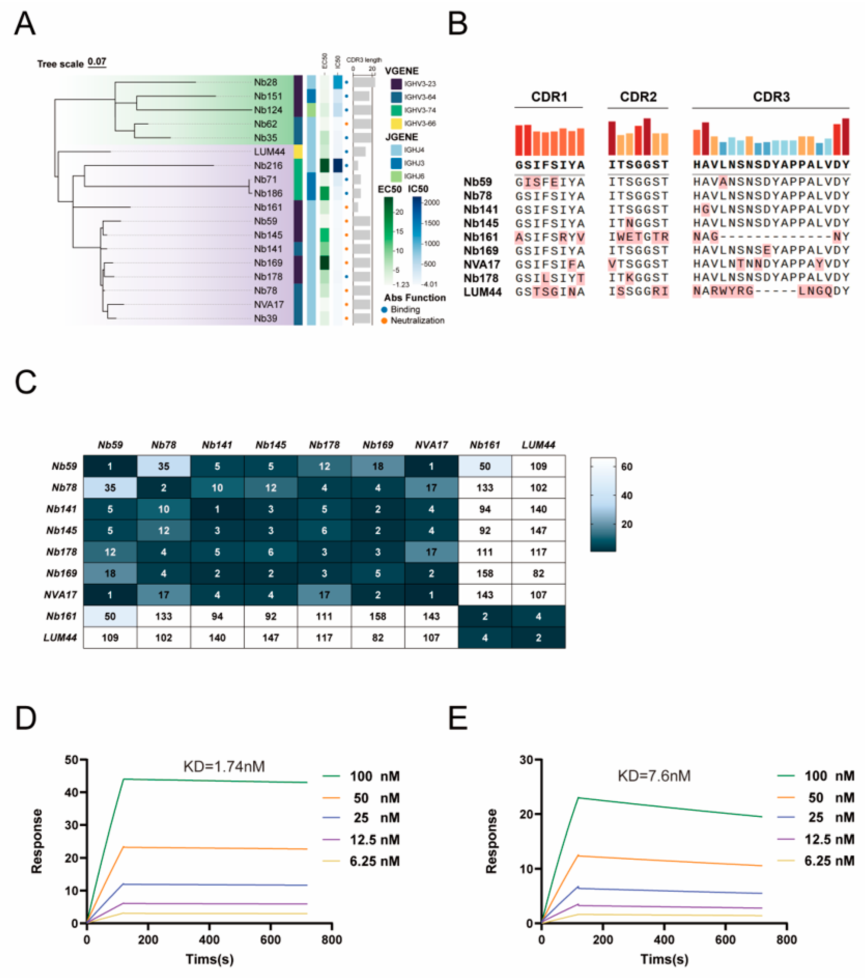 Phylogenetic analysis revealed a significant correlation between VHH sequences and their functional activities, with neutralizing, binding-only, and non-binding nanobodies forming distinct clusters. This genotype-phenotype association suggests that the functional divergence of nanobodies may originate from their specific germline origins and differences in complementarity-determining region (CDR) architectures. Previous studies have reported that nanobodies can target cryptic and conserved epitopes on the viral surface through their CDRs [