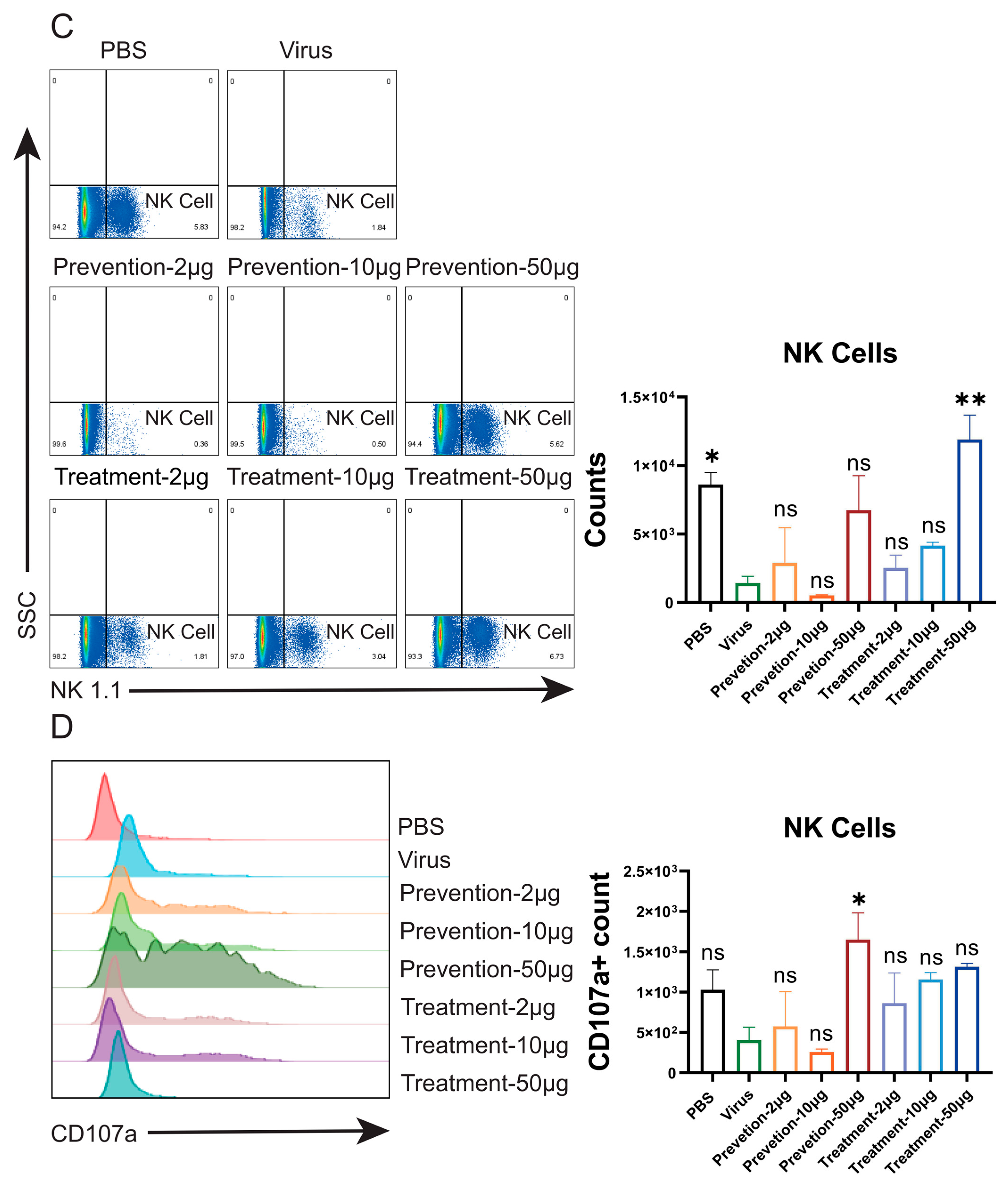 Flow cytometric analysis in mouse models demonstrated that NVA17 reversed virus-induced lymphopenia and enhanced the activation and function of key immune cells. STAT1 is a central transcription factor in the interferon signaling pathway, critical for initiating innate and adaptive immunity. The extracellular neutralizing activity of antibodies can be mechanistically compromised by STAT1 deficiency, primarily due to impaired Fc-mediated effector functions. This impairment manifests as diminished ADCC and ADCP activities resulting from downregulated Fc receptor expression, coupled with functional deficits in NK cells due to maturation defects. Concurrent attenuation of IFN-γ signaling further weakens the overall immune response. Consequently, antibody efficacy evaluated in STAT1-deficient mice may substantially underestimate its true protective potential. Notably, NVA17 achieved complete protection against lethal infection in this immunocompromised STAT1+/− model, unequivocally demonstrating its robust efficacy. It is crucial to emphasize that the lethal HAdV-4 infection model in STAT1+/− mice better recapitulates the clinical scenario of severe adenovirus infection in immunodeficient patients, who are most susceptible to adverse outcomes. Thus, this model not only enhances the clinical relevance of our findings but also provides a more stringent and credible platform for evaluating candidate therapeutics.