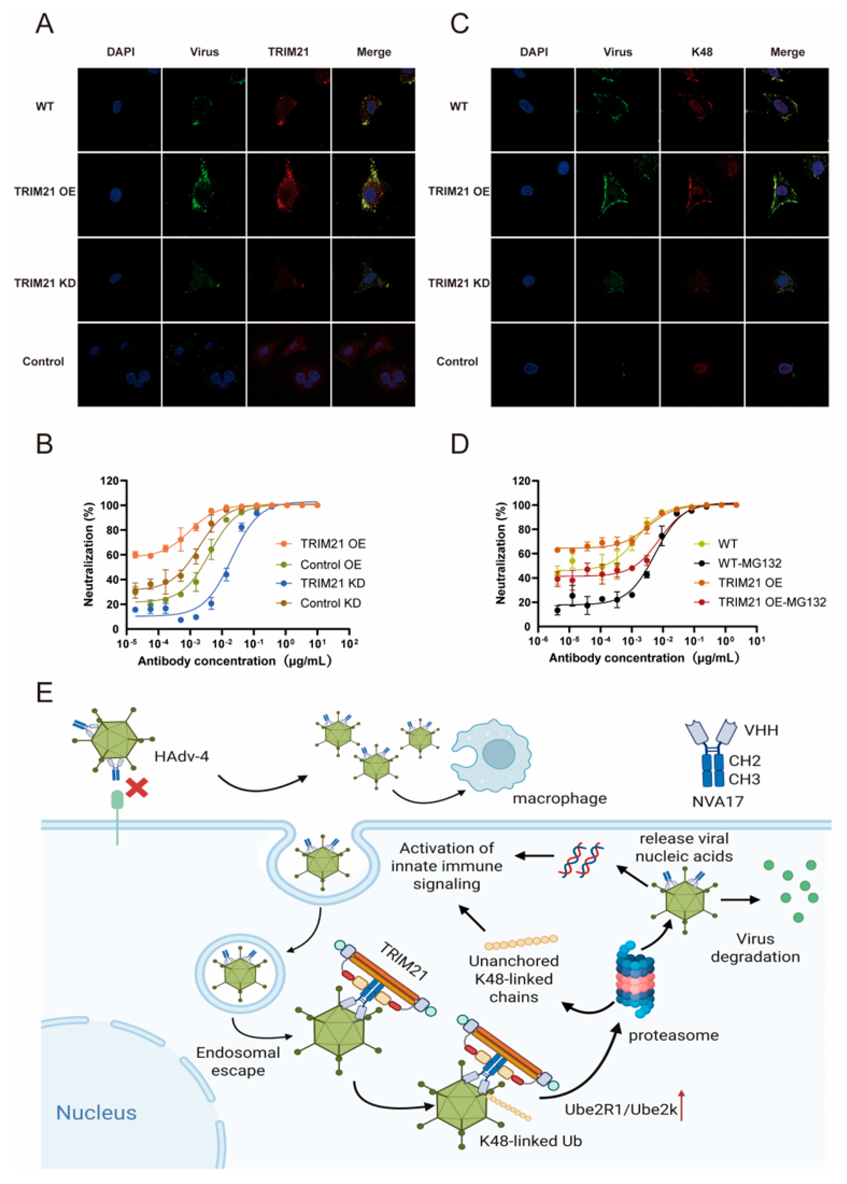 25]. This study reports the development and functional validation of a panel of nanobodies targeting the hexon protein of human adenovirus type 4 (HAdV-4). The engineered candidate nanobody, NVA17, fused with a human Fc fragment, demonstrated notable therapeutic efficacy in vitro and in vivo. Our work not only identifies a potent neutralizing antibody against HAdV-4 but also comprehensively validates the downstream immune responses activated by this antibody in vivo, as well as the intracellular immune mechanisms involved—particularly underscoring the role of TRIM21 in mediating viral neutralization.