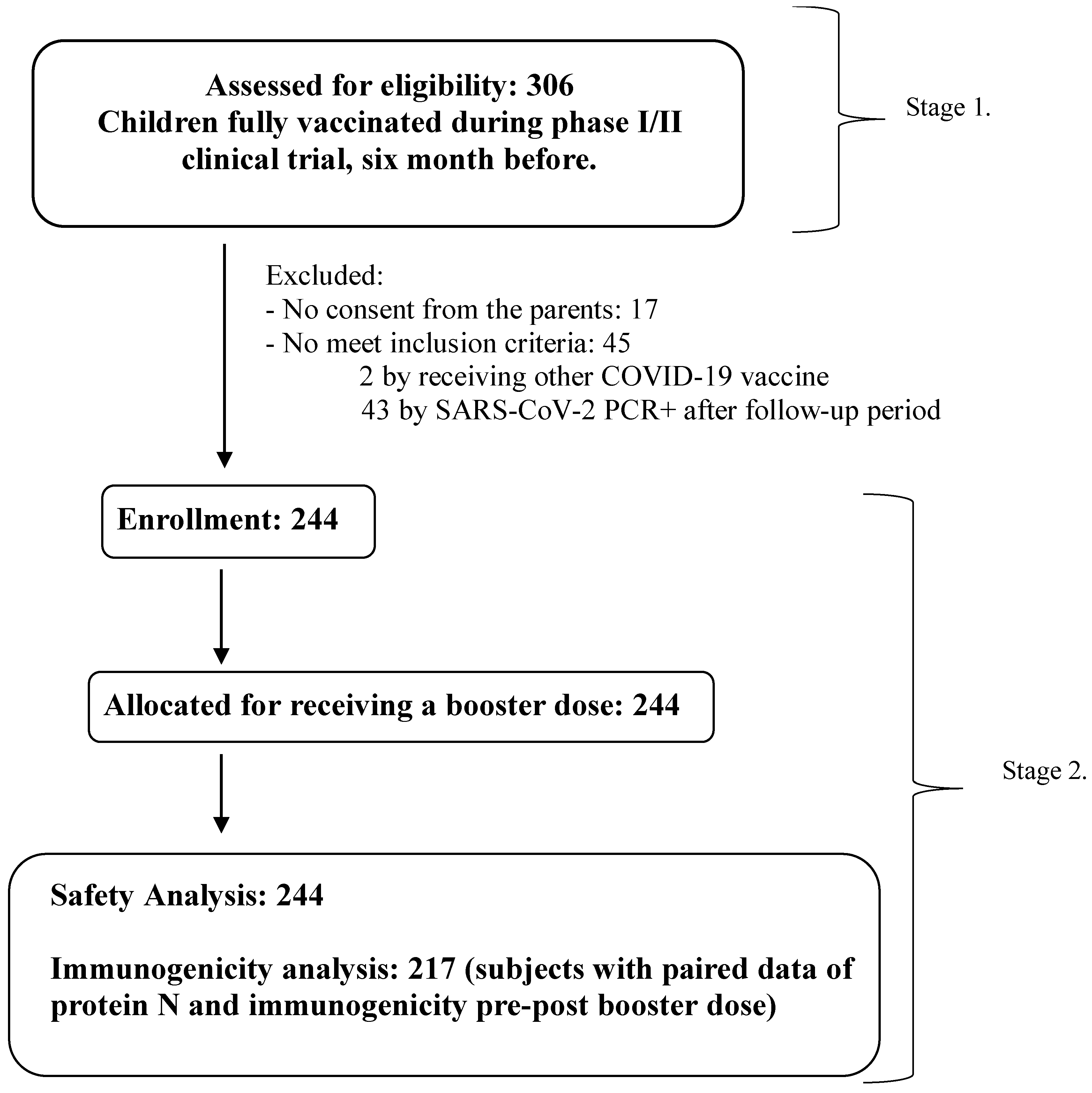 For Stage 2, a new written informed consent was obtained from the parents or legal guardians, and informed assent was also obtained from the adolescents (participants aged 12–18 years). Participants with a confirmed RT-PCR diagnosis of SARS-CoV-2 infection during the follow-up period were excluded from receiving the booster dose of SOBERANA® Plus.