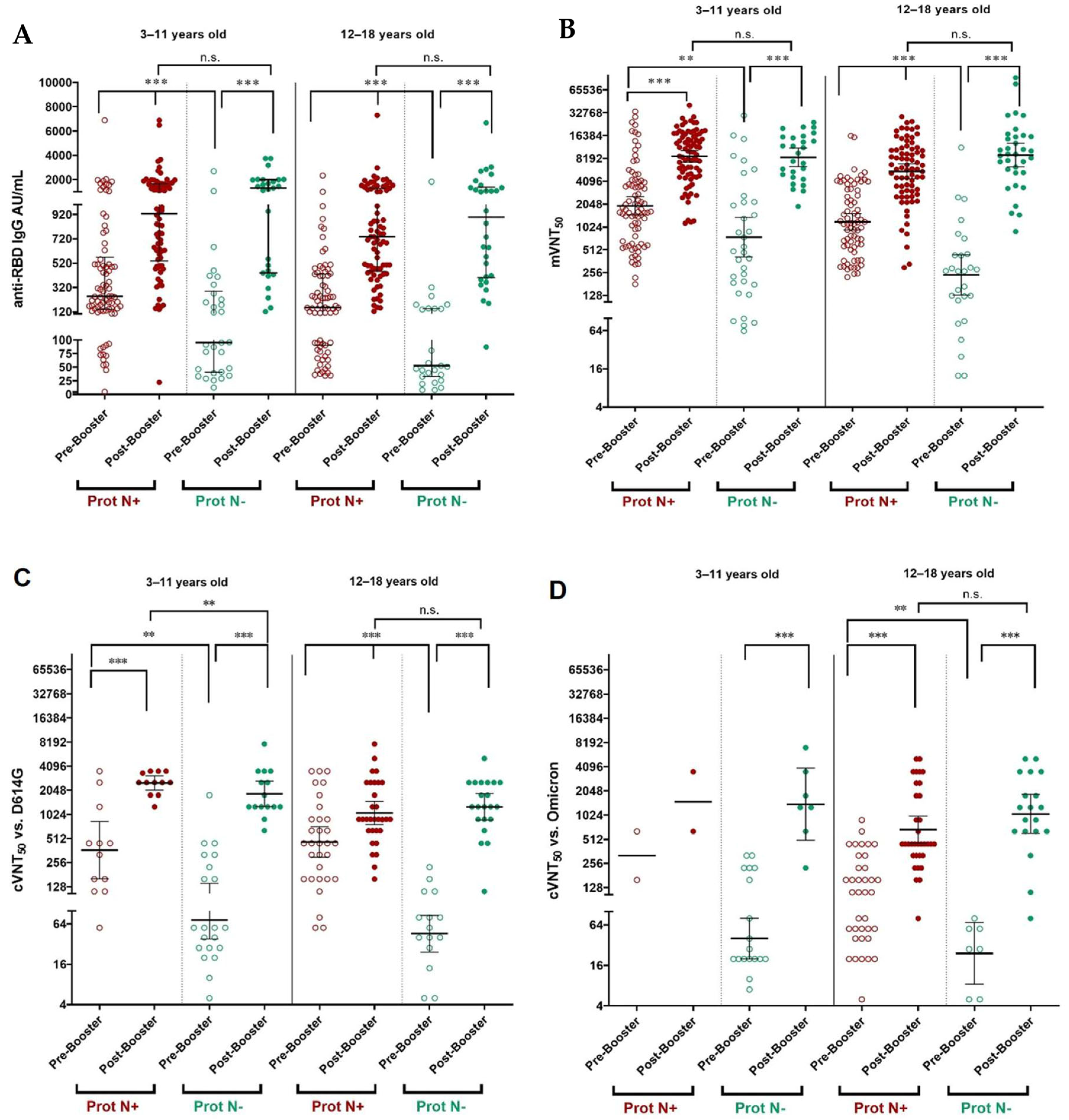 Figure 2. Antibody response before and 28 days after a booster dose with SOBERANA® Plus, in protein N-negative (Prot N−) and positive (Prot N+) children aged 3–11 and 12–18 y/o. (A) Anti-RBD IgG concentration expressed in AU/mL (median, 25th–75th percentile) (Prot N−; n = 61/Prot N+; n = 156). (B) Molecular virus neutralization titer mVNT50, highest serum dilution inhibiting 50% of RBD:hACE2 interaction GMT [95% CI] (Prot N−; n = 61/Prot N+; n = 156). (C) Conventional live-virus neutralization titer cVNT50 GMT [95% CI] against SARS-CoV-2 D614G variant (Prot N−; n = 36/Prot N+; n = 43); (D) Conventional live-virus neutralization titer cVNT50 GMT [95% CI] against SARS-CoV-2 Omicron BA.1 variant (Prot N−; n = 26/Prot N+; n = 26). Statistics: Wilcoxon Signed-Rank Test (before-after booster) and Mann-Whitney U test (Prot N+ vs. Prot N− subjects); ** p < 0.005, *** p < 0.0005. ns, not significant.