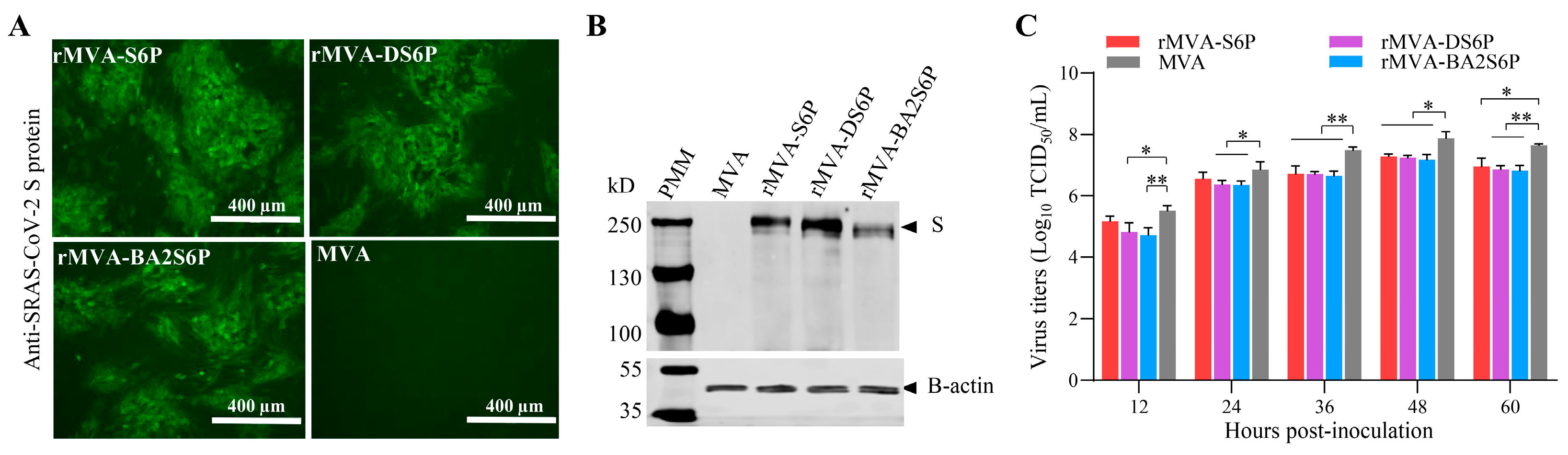 3.2. Generation of Recombinant MVAs Expressing the S Genes of SARS-CoV-2
