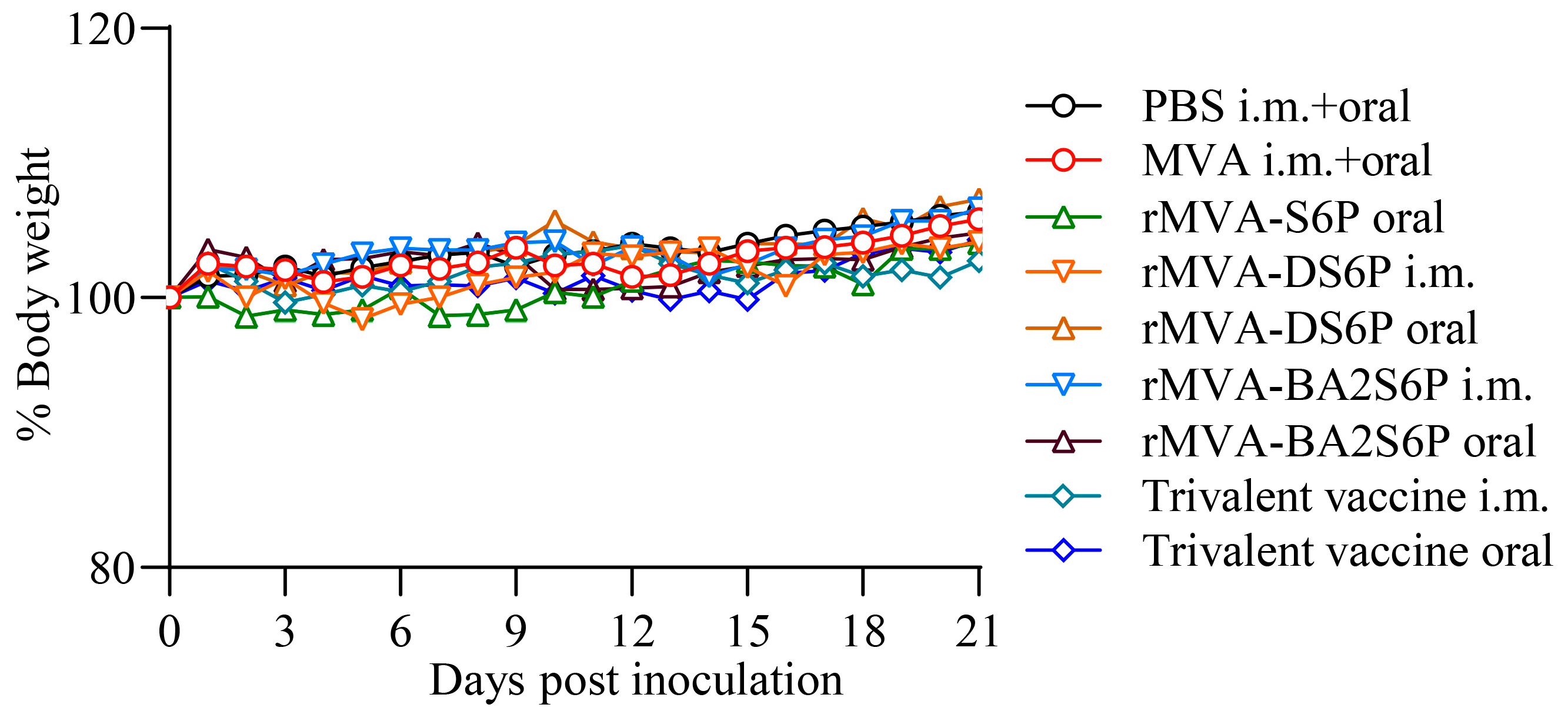 3.3. Introduction and Expression of SARS-CoV-2 S Genes Do Not Increase the Virulence of the MVA Vector in Mice