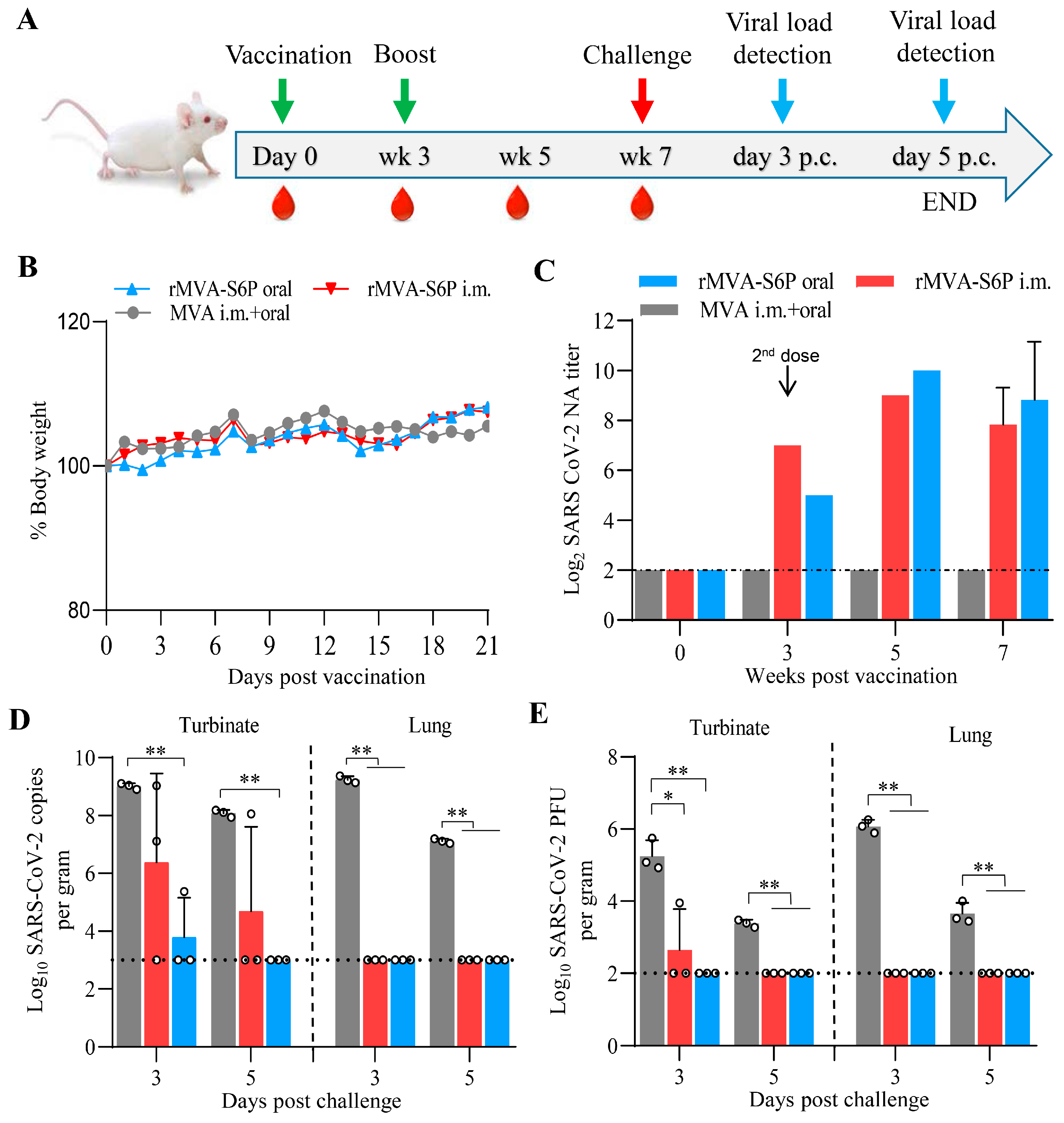 3.4. Recombinant Virus rMVA-S6P Elicits a Robust NA Response and Provides Complete Protection Against the SARS-CoV-2 Challenge in Mice