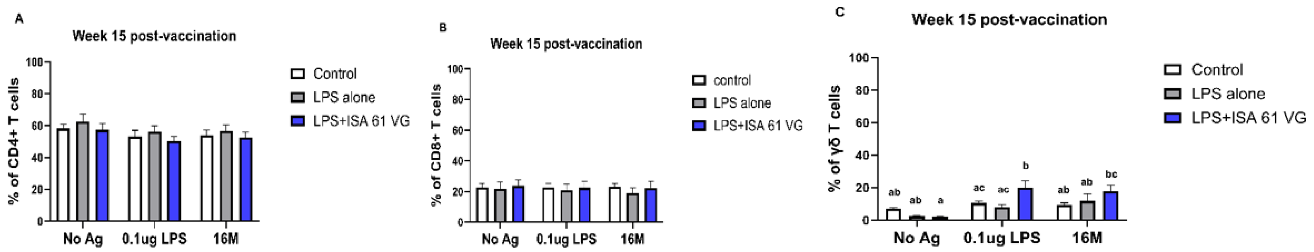 Figure 3A–C). However, goats vaccinated with LPS + ISA61VG demonstrated increased frequencies of γδ T cells when stimulated with Brucella LPS compared to those vaccinated with LPS alone or the control group. Furthermore, goats that received the LPS + ISA61VG exhibited notably higher frequencies of γδ T cells after stimulation with either LPS or killed 16M bacteria when compared to their unstimulated cells (