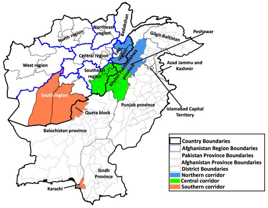 Regions/provinces of Afghanistan and Pakistan, critical districts and cities affected by poliovirus transmission, and intercountry transmission corridors—2014–2024.