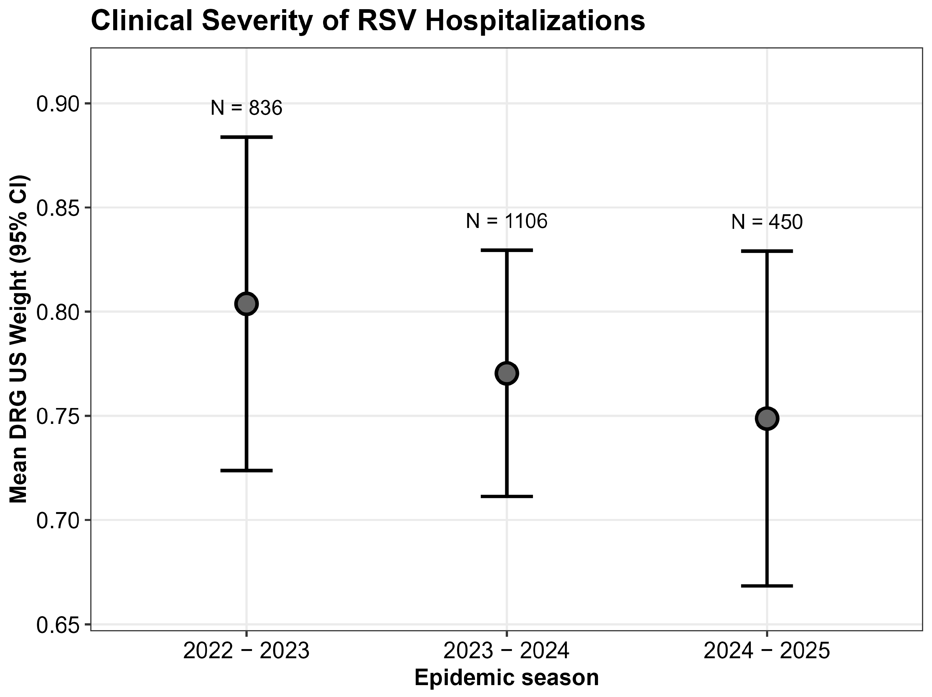 An additional consideration concerns the severity of RSV-related illnesses in hospitalized children, which in our study does not appear to differ in 2024–2025 compared with previous seasons. In contrast, pivotal clinical trials suggested that immunization could also have an impact on disease severity. Nevertheless, our findings may not be inconsistent with trial results for two main reasons. First, DRG attribution is primarily tariff-based and is not designed to capture clinical severity with sufficient accuracy. Secondly, since immunization coverage reached approximately 70%, the infants hospitalized in 2024–2025 likely represent the non-immunized fraction of the population. Consequently, it is expected that their severity profile would mirror that of patients in seasons when monoclonal antibodies were not available. Therefore, their clinical presentation and disease severity remained consistent with historical patterns, confirming that in the absence of protection, the clinical burden on the individual patient is unchanged. Last but not least, recent observational studies have highlighted that reductions in hospitalization rates do not necessarily translate into decreases in the clinical severity of cases requiring admission [