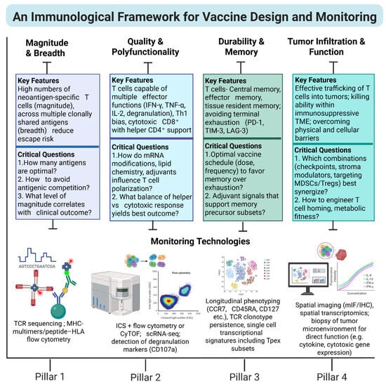 An immunological framework for mRNA cancer vaccine design and evaluation. Four measurable pillars define the potency of mRNA vaccine-induced anti-tumor immunity. This framework integrates design principles with immune monitoring to capture the multidimensional nature of therapeutic responses. (1) Magnitude and breadth—expansion of polyclonal, neoantigen-specific T cells that minimize immune escape; (2) Quality and polyfunctionality—induction of CD8+ cytotoxic and CD4+ helper T cells with coordinated cytokine secretion (IFN-γ, TNF, and IL-2); (3) Durability and memory—establishment of central, effector, and tissue-resident memory subsets sustaining long-term tumor control; and (4) Tumor infiltration and function—efficient trafficking, persistence, and cytolytic activity within the immunosuppressive tumor microenvironment. These pillars provide a unifying conceptual and analytical framework for linking molecular vaccine design parameters to functional immune readouts in clinical trials. Abbreviations: cyTOF, cytometry by time-of-flight; HLA, human leukocyte antigen; ICS, intracellular staining; IHC, immunohistochemistry; MHC, major histocompatibility complex; mIF, multiplex immunofluorescence; MDSC, myeloid-derived suppressor cells; Tregs, regulatory T cell; Tpex, progenitor exhausted T cell; TME, tumor microenvironment; TCR, T cell receptor; scRNA-seq, single-cell RNA sequencing.