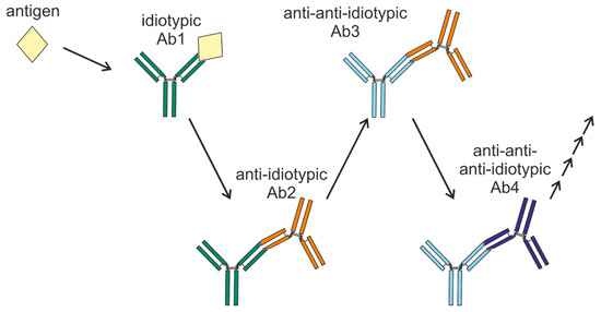 Anti-idiotypic responses can be induced not only by Ab1 idiotypic antibodies but also by anti-Id Abs (Ab2) (Figure 2). To illustrate, anti-anti-Id Abs (Ab3) were generated in rabbits immunized with polyclonal Ab2 induced by purified Ab1 produced in response to carbohydrate immunization of Micrococcus lysodeikticus bacteria [18]. Comparable results were observed in BALB/c mice that were immunized with myeloma levan-binding protein. These mice produced not only Ab2 antibodies but also Ab3 antibodies, which were further used for the induction of anti-anti-anti-Id Abs (Ab4) [19]. The Ab1 and Ab3 members of this idiotypic cascade are linked by a shared cross-reactive regulatory idiotope that interacts with both Ab2 and Ab4 [19]. The same sequential progression of the idiotypic cascade has also been identified in humans, specifically in cancer patients undergoing treatment with therapeutic antibodies [20]. Idiotypic cascades have been reported to result in anti-anti-anti-anti-idiotype (Ab4) and even in Ab6 [21]. Figure 2 presents a schematic representation of the anti-Id Ab cascade formation.