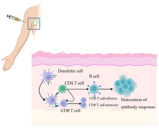 The study of the immune response to vaccines has been facilitated by the fine needle aspiration technique, which has enabled monitoring of the immune response elicited in the adjacent draining lymphoid tissue following vaccination. When a vaccine is administered, antigen-presenting cells (APCs), usually dendritic cells, take up antigens and then travel to the draining lymph node. Signals displayed on major histocompatibility complex class II molecules are then recognized by the T-cell receptor (TCR) on T cells, which subsequently leads to their activation. T-follicular helper cells and specialized CD4+ T cells carry a variety of signals to the B cells in the germinal center (GC) (Figure 1). These signals trigger a GC reaction, where the activated B cells undergo somatic hypermutation. Shortly after, the high affinity B cells are positively selected and subsequently differentiate into plasma cells and memory B cells. The plasma cells produce antibodies that can potentially neutralize the pathogen. Memory B-cells serve as a second line of defense by rapidly generating a burst of plasma cells that produce antibodies upon re-exposure to the pathogen [18,19,20,21]. CD8+ T-cells also play an important role in the immune response to some pathogens and vaccines. CD8+ T cells frequently recognize proteins on the surface of APCs and then become activated. Upon activation, CD8+ T cells employ two primary mechanisms to exert their effect. The first mechanism involves lysing infected cells by secreting effector molecules such as perforin and granzyme B, which create pores in the target cells. The second mechanism involves the death of the infected cells through the interaction of the Fas ligand and Fas receptor [22,23,24]. Therefore, the immune response to the vaccine frequently involves a collaboration between B cells and T cells (Figure 1).