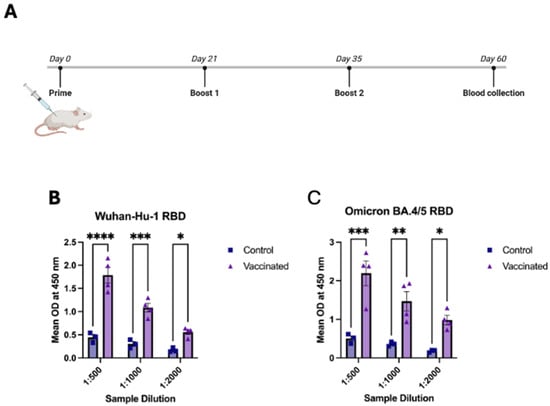 3.3. In Vivo Evaluation of Serum Antibody Responses Following Tetravalent RBD–Fc Vaccination