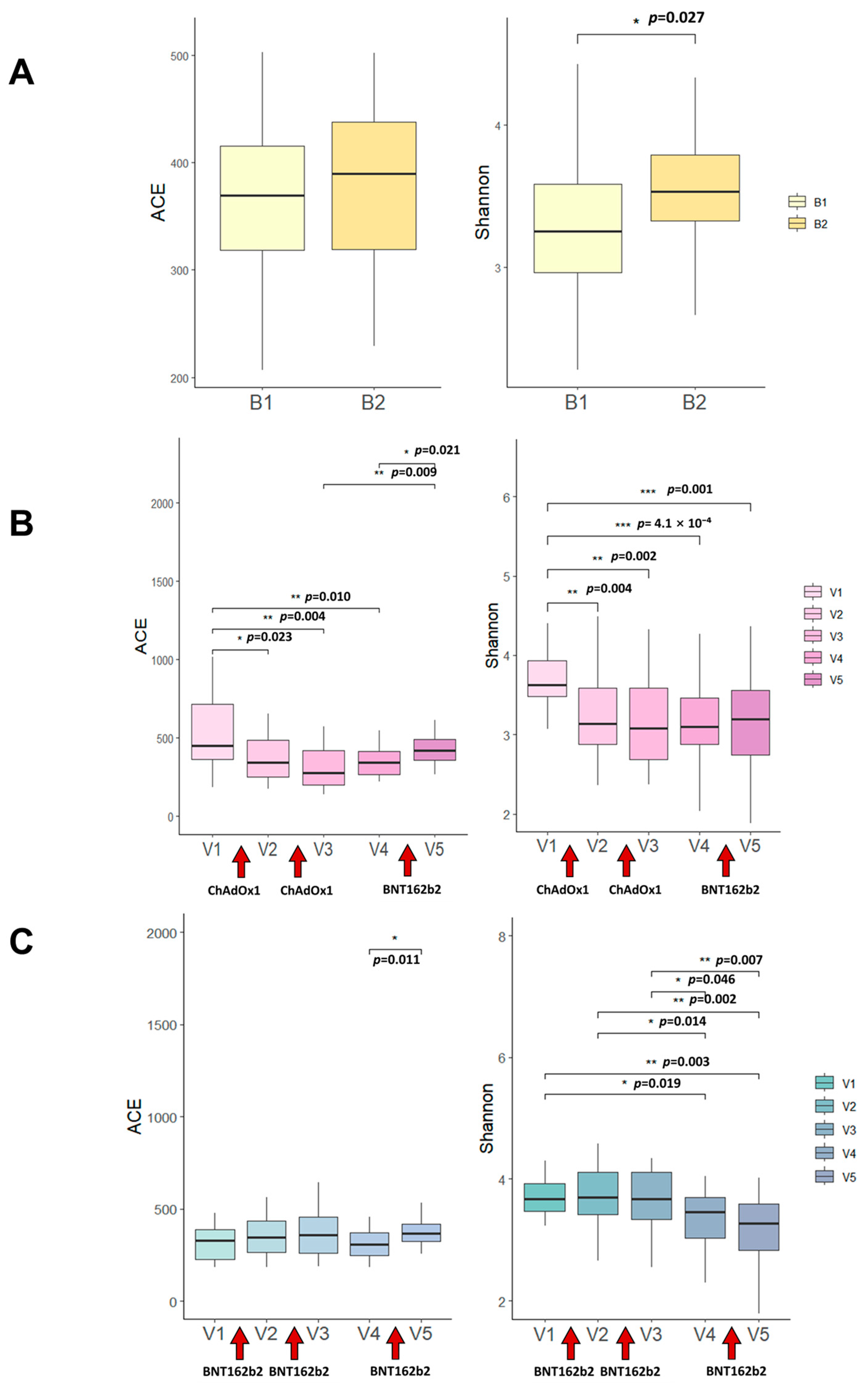3.1. NVX-CoV2373 Booster Increases Gut Microbiome Alpha Diversity