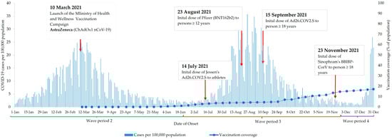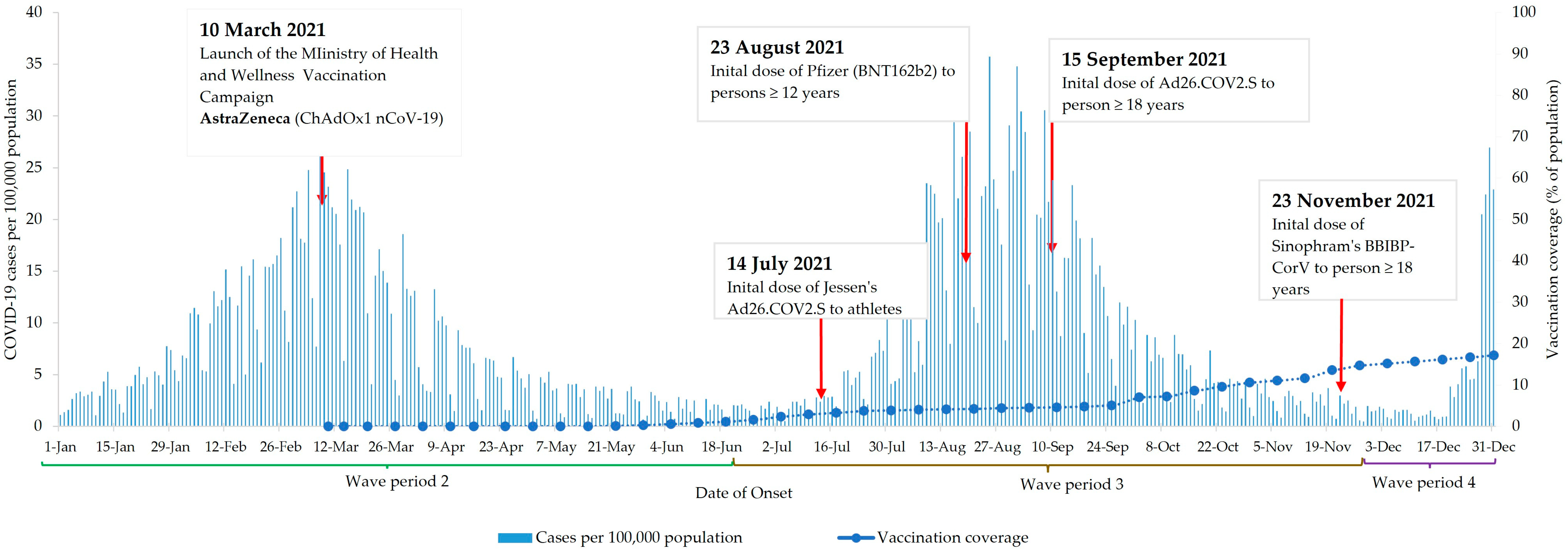 The MOHW launched its vaccination campaign on 10 March 2021—close to the peak of the second wave. At the time, AstraZeneca (ChAdOx1 nCoV-19) was the only vaccine available. The Pfizer vaccine was initially administered on 23 August 2021, while Johnson and Johnson (Ad26.COV2.S) and Sinopharm (BBIBP-CorV) vaccines were introduced to the general population on 15 September and 23 November 2021, respectively. As of 31 December 2021, vaccination coverage was 17%. The analysis period ended at the beginning of the fourth wave (Figure 1).
