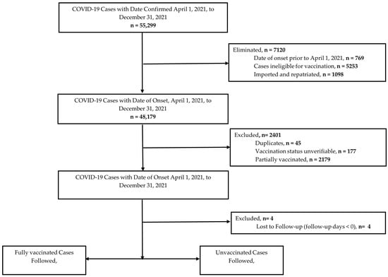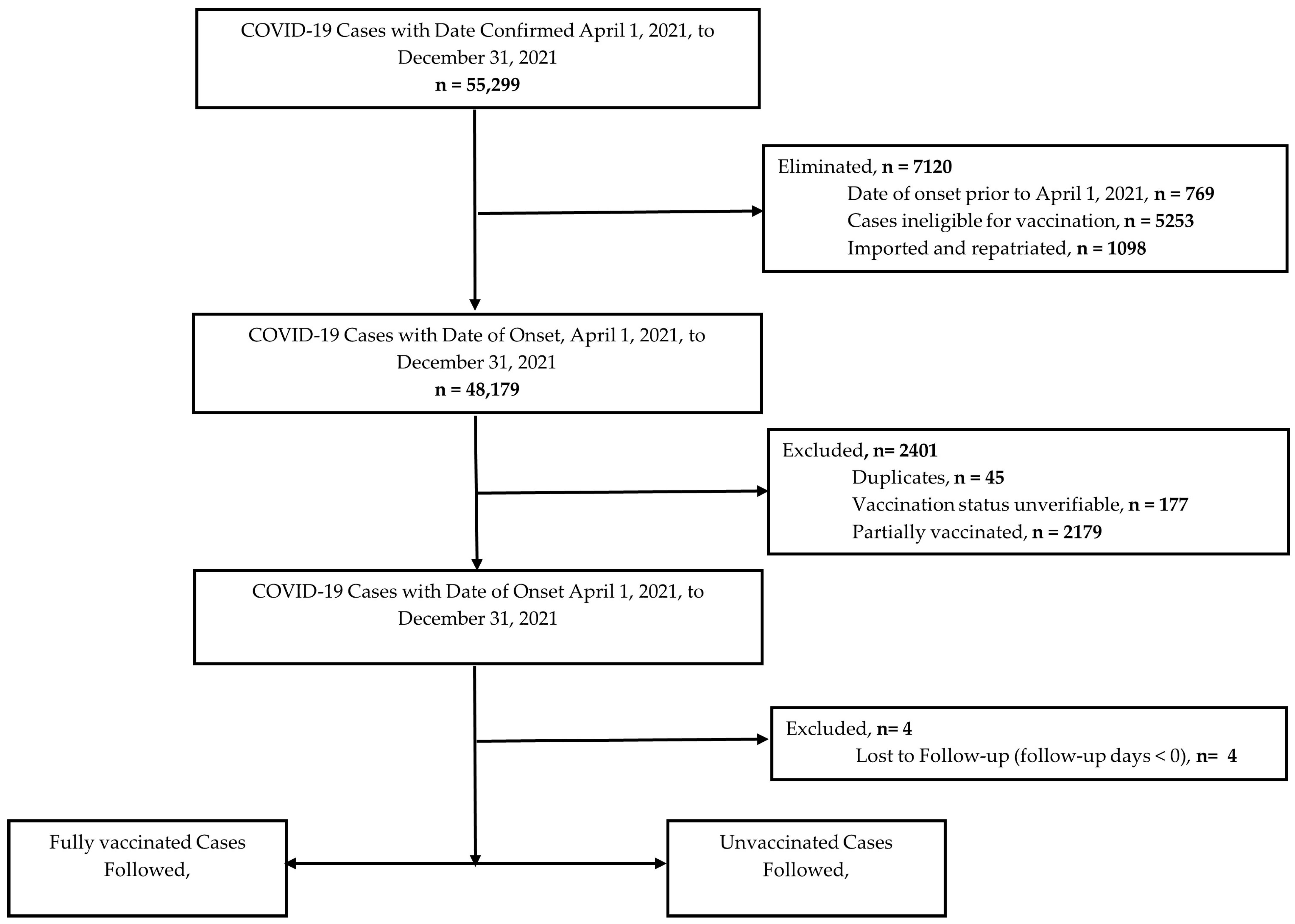 Exclusion criteria included the following: (a) Cases with a date of onset prior to 1 April 2021; (b) cases ineligible for vaccination; (c) imported and repatriated cases; and (d) partially vaccinated, i.e., having had only a single dose of a 2-dose vaccine.