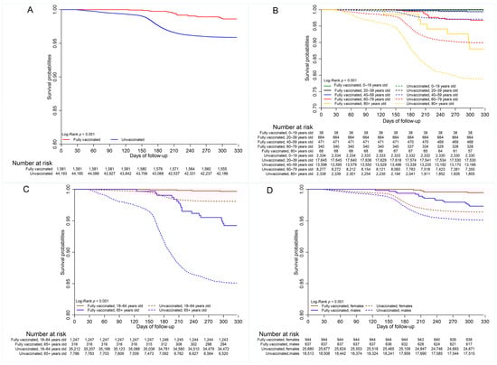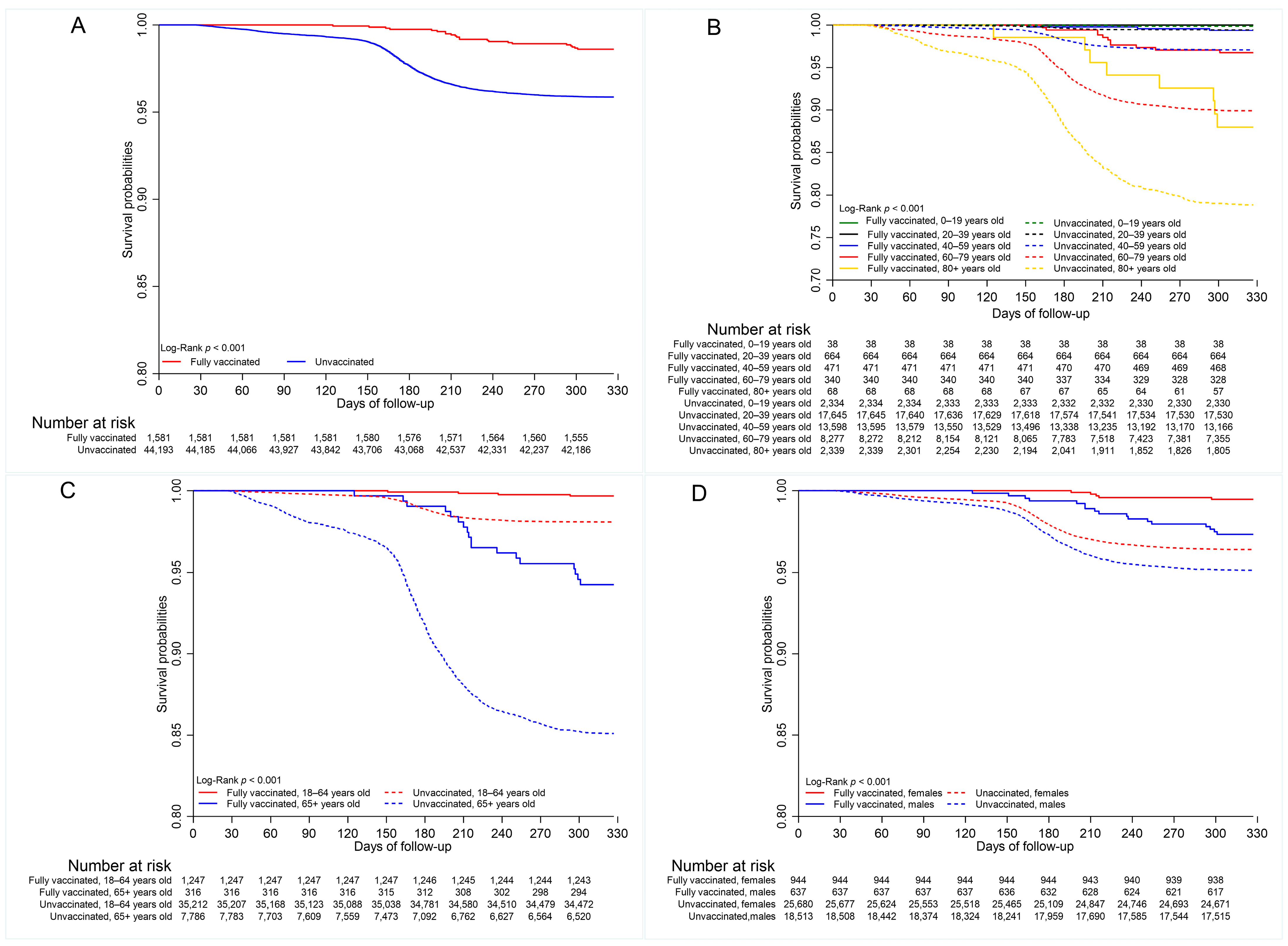 Multiple comparison tests indicated differences in mortality between vaccinated and unvaccinated cases in the working-age group (p < 0.01) and elderly population (p <0.001) (Supplemental Table S3), as well as by sex. The probability of survival was greater for vaccinated individuals in both age categories (Supplemental Table S2, Figure 3C). There was no difference in COVID-19 mortality between unvaccinated females and males who were vaccinated (0.963 vs. 0.979, p = 0.999), as well as between the unvaccinated females and unvaccinated males (0.963 vs. 0.950, p = 0.120), indicating that males had lower survival than females in the vaccinated and unvaccinated groups (Figure 3D, Supplemental Table S2).
