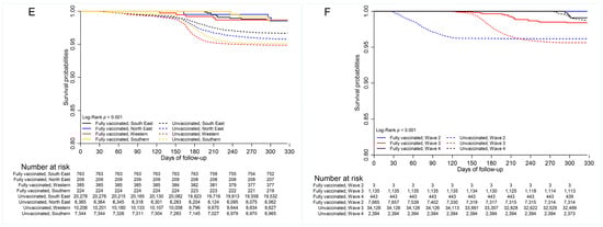 Survival by (A) vaccination status (B) age group (20-year age category); (C) age group (18–64 years vs. 65+ years); (D) sex; (E) geographic (health) regions; (F) wave periods.