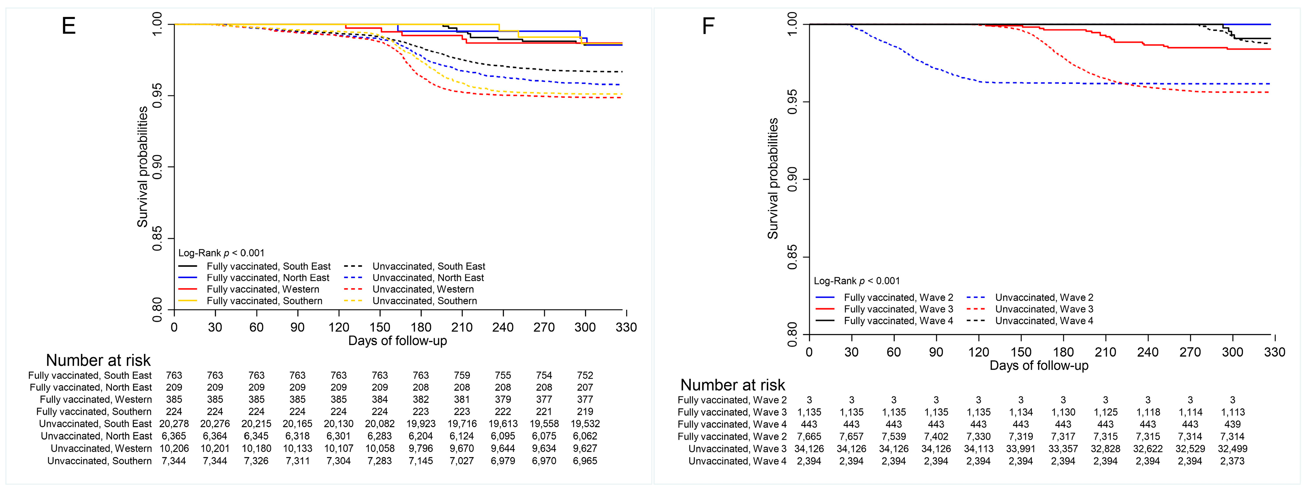 Additionally, multiple comparison tests indicated no difference in survival among geographic regions for vaccinated cases (p > 0.05, Supplemental Table S3). Multiple comparison tests further showed that survival was statistically similar for vaccinated cases in all wave periods (p > 0.05) (Supplemental Table S3). However, survival probabilities differed significantly between the fully vaccinated and unvaccinated cases for wave periods three (0.989 vs. 0.947, p < 0.001) and four (0.986 vs. 0.950, p < 0.001). Survival of unvaccinated cases was greater in wave period four than in wave periods two (0.983 vs. 0.964, p < 0.001) and three (0.983 vs. 0.955, p < 0.001). It was, however, greater in wave period two compared to wave period three (0.964 vs. 0.955, p = 0.039).