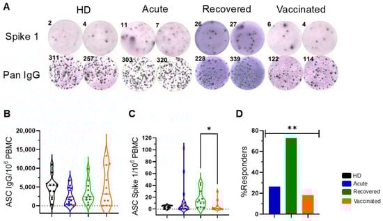 Spike-1-specific antibody-secreting cells (ASCs) in patients with COVID-19 and vaccinated individuals. (A) Representative colored spots of pan IgG+ and Spike-1-specific ASCs were demonstrated in healthy donors (HDs), patients with acute COVID-19 (acute), recovered individuals (recovered), and vaccinated individuals (vaccinated). Numbers represent thecounted spots in each well HDs (n = 11) are shown in black, patients with acute COVID-19 (n = 19) are shown in blue, unvaccinated, recovered individuals (n = 11) are shown in green, and vaccinated individuals (n = 11) after 35 days of the second dose of AZD1222 are marked in orange. (B) The frequencies of “pan” IgG+ ASCs and (C) of Spike-1-specific ASCs relative to 106 peripheral blood mononuclear cells (PBMCs) are demonstrated. Red dots indicate five acute fatal cases. Violin plots show the median (middle line) and describe numerical data distributions using density curves. In (D), the frequency of responders, considering people with detected Spike 1 antigen-specific ASCs above or equal to 10, is represented in bars. p values were calculated using the Kruskal–Wallis test, Dunn’s multiple comparisons test (B,C), and the chi-square test t (D). * p < 0.05, ** p < 0.001.