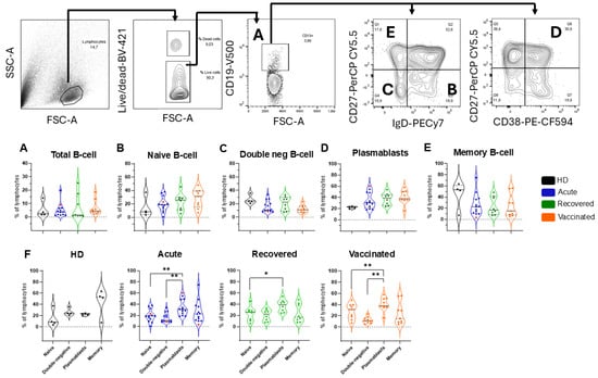 Frequencies of total B cells and B cell subpopulations in all groups of individuals. The gating strategy is displayed by arrows pointing to the next gating level. After selecting the morphological gate (FSC-A x SSC-A), a gate with only viable cells was selected, considering those whose dye reactivity is restricted to cell surface amines, resulting in less intense fluorescence. The frequencies of (A) total B cells (CD19+): (B) naïve B cells (CD27-IgD+), (C) double-negative B cells (CD27-IgD−), (D) plasmablast cells (CD27+CD38+), and (E) memory B cells (CD27+IgD−). Healthy donors (HD; n = 4) are shown in black, patients with acute COVID-19 (acute; n = 13) are shown in blue, unvaccinated, recovered individuals (recovered; n = 8) are shown in green, and vaccinated individuals (vaccinated; n = 11) after 35 days of the second dose of AZD1222 are marked in orange. Red dots indicate three acute fatal cases. Violin plots show the median (middle line) and describe numerical data distributions using density curves. p values were calculated using the Kruskal–Wallis test, Dunn’s multiple comparisons test (A–E), and the Wilcoxon matched-pairs signed rank test t (F). * p < 0.05, ** p < 0.01. HD, healthy donor.