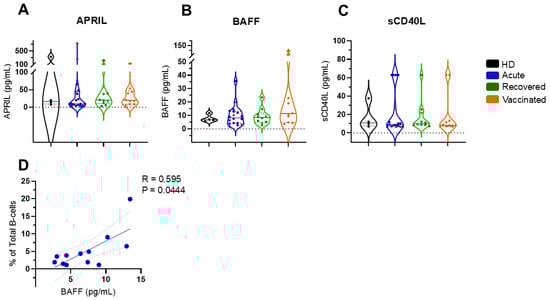Quantification of soluble APRIL, BAFF, and CD40L in all groups of individuals. For (A) APRIL, (B) BAFF, and (C) CD40L, quantification in healthy donors (HDs; n = 4 in black), patients with acute COVID-19 (acute; n = 18 in blue), unvaccinated, recovered COVID-19 individuals (recovered; n = 10 in green), and vaccinated individuals (vaccinated; n = 11 in orange) after 35 days of the second dose of AZD1222. Five fatal cases have been highlighted in red among the acute cases in blue. Violin plots show the median (middle line) and describe numerical data distributions using density curves. p values were calculated using the Kruskal–Wallis test, followed by Dunn’s multiple comparisons test. In (D), a statistically significant correlation is demonstrated between the total number of B cells and soluble BAFF levels in patients with acute COVID-19. The Spearman correlation test was used.