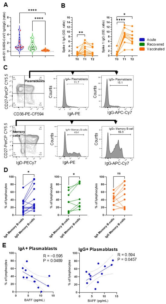 Differential profile of IgA and IgG plasmablast cells and memory B cells. (A) The circulating IgA/IgG ratio against the SARS-CoV-2 Spike 1 protein in patients with acute COVID-19 (acute; n = 28 in blue), unvaccinated, recovered individuals (recovered; n = 15 in green), and vaccinated individuals (vaccinated; n = 11 in orange) after the second dose of AZD1222. Red dots indicate eight acute fatal cases. Violin plots show the median (middle line) and describe numerical data distributions using density curves. p values were calculated using Kruskal–Wallis and Dunn’s multiple comparison test. Longitudinal (B) Spike 1 IgA and Spike 1 IgG are demonstrated before vaccination (T0) and over two doses (T1 = 14 days and T2 = 35 days) in 11 vaccinees. The Friedman test, followed by Dunn’s multiple comparison test, was used. (C) The gating strategy is displayed, with arrows pointing to the next gating level. Frequencies of IgA+ or IgG+ are shown in plasmablast cells (CD27+CD38+) and memory B cells (CD27+IgD−) in vaccinated individuals. (D) Data with statistical differences from the Wilcoxon matched-pairs signed-rank test in the acute, recovered, and vaccinated groups are presented. In (E), a statistically significant correlation is demonstrated between the IgA+ or IgG+ plasmablast cells and soluble BAFF levels in patients with acute COVID-19. The Spearman correlation test was used. * p < 0.05, ** p < 0.01, **** p < 0.0001, ns = non-significant.