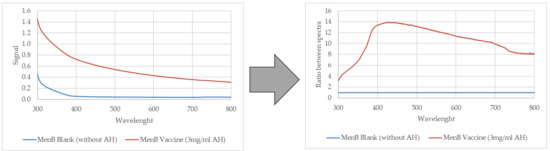 AH quantification was performed using the spectrophotometer Varioskan LUX Thermo Scientific that is a modular multi-technology plate reader and is controlled by Thermo Scientific SkanIt Software ver. 5.0.0.42 for Microplate Readers. The instrument also includes a plate shaking tool facilitated by an orbital shaking mode. The orbital shaking function is used for shaking the microplate to mix the samples in such a way to keep the AH in suspension during the analysis. For all experiments, orbital shaking was set at 1200 rpm for 1 min. As the AH is an opalescent suspension and because of the absence of a single clear absorption peak, the wavelength at which the optical signal of the selected sample shows the highest significative response was selected comparing the ratio between the aluminum suspension spectra and its blank within the visible range. Through the analysis of several spectra, 400 nm was selected as the optimal wavelength to perform a specific quantification of aluminum corresponding to the maximum ratio between the signal of the sample and the corresponding blank. Figure 1 reports an example of raw spectra for MenB formulation with and without AH (left) and the results after the analysis of the ratios between spectra (right).