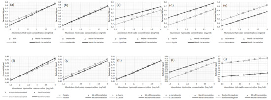 All calibrations performed with the different proteins where the abscissa axis shows the AH concentration, and the ordinate axis shows the signal obtained at 400 nm. In all figures, the marked black line indicates the calibration curve performed with the MenB antigens, while the proteins are presented in the following order: BSA (a); ovalbumin (b); lysozyme (c); pepsin (d); lactoferrin (e); dephosphorylated alpha-casein (f); fosvitin (g); alpha-casein (h); alpha-lactalbumin (i); bovine hemoglobin (j).