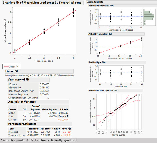 From the results in Figure 5, the R-squared of the linear fit is 0.986. In addition, no pattern in the residuals is visible from the residual plots, and no deviation from the normality assumption is evident from the normal quantile plot.