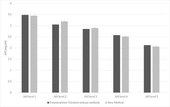 The comparison between spectrophotometric method and the official release method showed comparable results (Figure 6), confirming the potential implementation of this new method as a possible release test for AH-adjuvanted products.