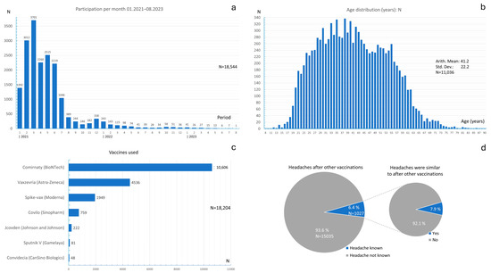 (a) Absolute frequency distribution of participation in the study depending on time; (b) absolute age distribution of participants across all vaccines; (c) absolute frequency distribution of the vaccines used; (d) frequency distribution of the occurrence of headaches with other vaccinations.