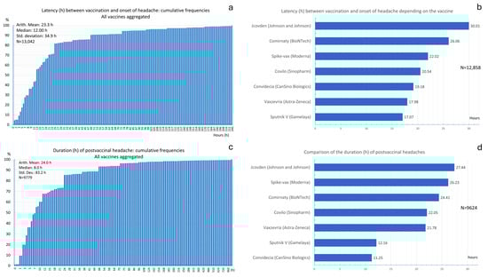 (a) Latency (in hours) between vaccine administration and the onset of postvaccinal headache across all vaccines; (b) comparison of latencies between vaccines; (c) cumulative frequencies of the duration of postvaccinal headache across all vaccines; (d) comparison of the mean duration of postvaccinal headache between vaccines.
