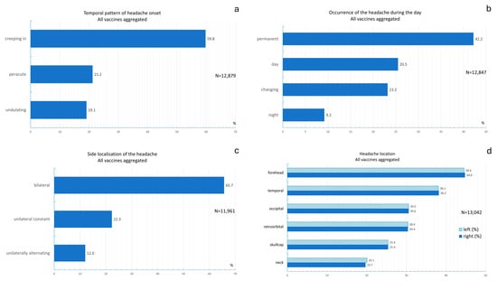 Figure 3a shows the distribution of the temporal pattern of headache onset. Across all vaccines, 59.8% of the headaches had an insidious onset; 21.2% of the headache had a peracute onset; and 19.1% of the headaches developed gradually. The chi-square test revealed significant differences in the temporal pattern of headache onset between vaccines (chi-square test: p < 0.001). Table S7 (Supplementary File S1) shows the temporal patterns in headache onset between vaccines. The most common pattern for Vaxzevria was a gradual onset (62.3%). A peracute onset was most frequently reported for Convidecia (28.6%). An undulating onset of headache was most common for Covilo 35.9%.