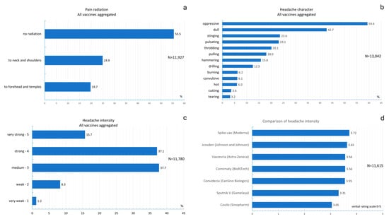 (a) Frequency distribution of pain radiation across all vaccines; (b) frequency distributions of headache characteristics across all vaccines; (c) frequency distribution of headache intensities aggregated across all vaccines; (d) analysis of headache intensity between vaccines.