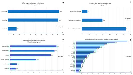 (a) Frequency distribution of the effects of routine physical activity on headaches across all vaccines; (b) frequency distribution of the effect of body position on headaches across all vaccines; (c) frequency distribution of migraine-like concomitant symptoms of headache across all vaccines; (d) frequency distribution of other concomitant symptoms, aggregated for all vaccines used.