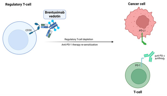 Illustration representing the mechanism of action of BV. BV depletes CD30+ regulatory T cells, enhancing the activity of cytoxic T cells, and promoting the re-sensitization of anti-PD-1 therapy.