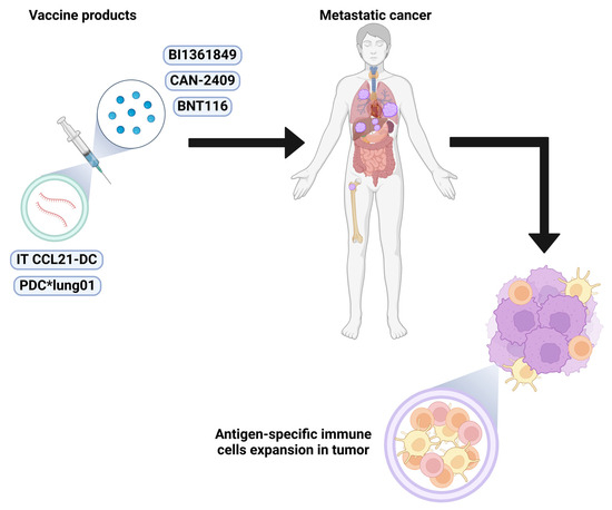 CCL21 is a chemokine involved in promoting leukocyte chemotaxis and activation. Previously, intratumoral administration of murine dendritic cells genetically modified to express CCL21 led to significant tumor response in a murine lung cancer model [80]. This work provided the rationale for a phase I clinical study evaluating intratumoral administration of autologous dendritic cells transduced with an adenoviral vector expressing the CCL21 gene (CCL21-DC) (Figure 5) [81]. Sixteen patients with advanced NSCLC received two vaccinations of varying doses (1 × 106, 5 × 106, 1 × 107, or 3 × 107 dendtric cells/injection) via computed tomography (CT) or bronchoscopic-guided intratumoral injections. Increased CD8+ T-cell infiltration was found in 54% of patients, and this subset of patients was also found to have increased PD-L1 expression [81]. It was hypothesized that the tumor-mediated impairment of T-cell function could lead to a decreased anti-tumor response from CCL21-DC. A phase I study evaluating the combination of intratumoral CCL21-DC and pembrolizumab is currently recruiting patients [52]. The study plans to enroll 24 patients with dose escalation followed by dose expansion with aim of determining the maximum tolerated dose (MTD) and subsequently the objective response rate at the MTD [52].